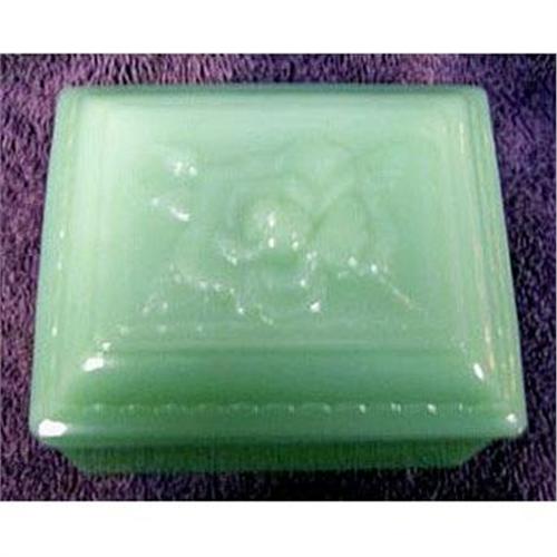 Produced in lovely Jadeite glass by Anchor Hocking, in their Fire King line, as a novelty item and advertised as a cigarette box. It features an embosed rose on the lid, measures 3 1/2" X 4 1/2" with both the lid and box in excellent condition.