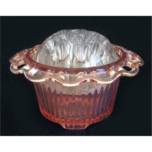 This pink, ribbed, laced edge glass flower bowl or vase with crystal frog insert was made by Hocking Glass from 1935-1938, in the Depression Glass pattern known as Old Colony or Open Lace and Lace Edge. The 3.5 inch tall, 7 inch diameter bowl has tabbed feet and is the same bowl used as the base for the lidded candy jar in this pattern. The crystal flower frog has nineteen holes and is 2.5 inches in height, tapering to its base, on which the flower holes open out. The very bottom of the frog has some roughness and discolouration, while the bowl is in excellent condition with no damage to the delicate lace edge.