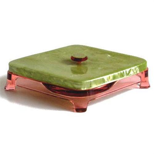 Produced by the Cambridge Glass Co. of Cambridge, OH, during the 1920s or 1930s. This Art Deco, pink Depression glass base with a green celluloid lid, make-up Compact or Compartment Dresser Set features four sections for powder, puff, eyebrow pencil, lipstick and rouge in the base. Measuring about 8 1/2" square 2 1/2" tall with both the lid and tray in excellent condition.