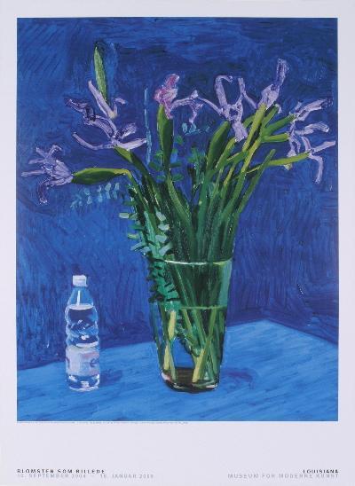 Reference #: ULCB5004 Artist Name: Hockney, David Title: Iris with Evian bottle Medium: Offset Lithograph Edition Size: Unknown Year: Unknown Paper Size: 33.25 x 24.25 inches Image Size: 27.75 x 22 inches Condition: A: Mint Notes: Original exhibition poster for "Blmosteinsom Billede" September 20, 2004 - January 16, 2005 at Louisiana Museum of Modern Art