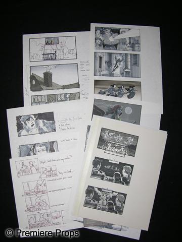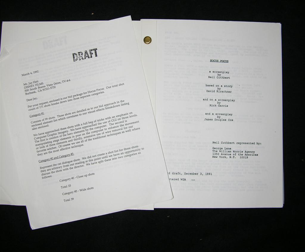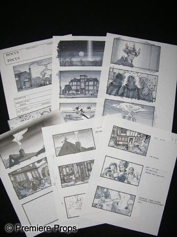 Hocus Pocus (1993) - Sixteen pages of original hand drawn color storyboards of VFX sequences. Includes a special acetate layover storyboard to show compositing and two cut out storyboards. Also includes original screenplay by Neil Cuthbert and Mick Garris dated 3rd draft 12/3/91. Storyboards are in a Buena Vista FX envelope and marked "SCAN" with a VFX memo.