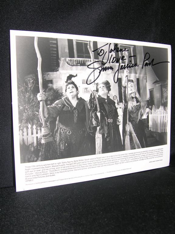 8 x 10 black and white photo from the film Hocus Pocus, depicting the film's three central witches, Kathy Najimy, Bette Midler and Sarah Jessica Parker. Parker has signed and personally inscribed the photo in black ink. This photo has studio-written information at its bottom. (8x10)