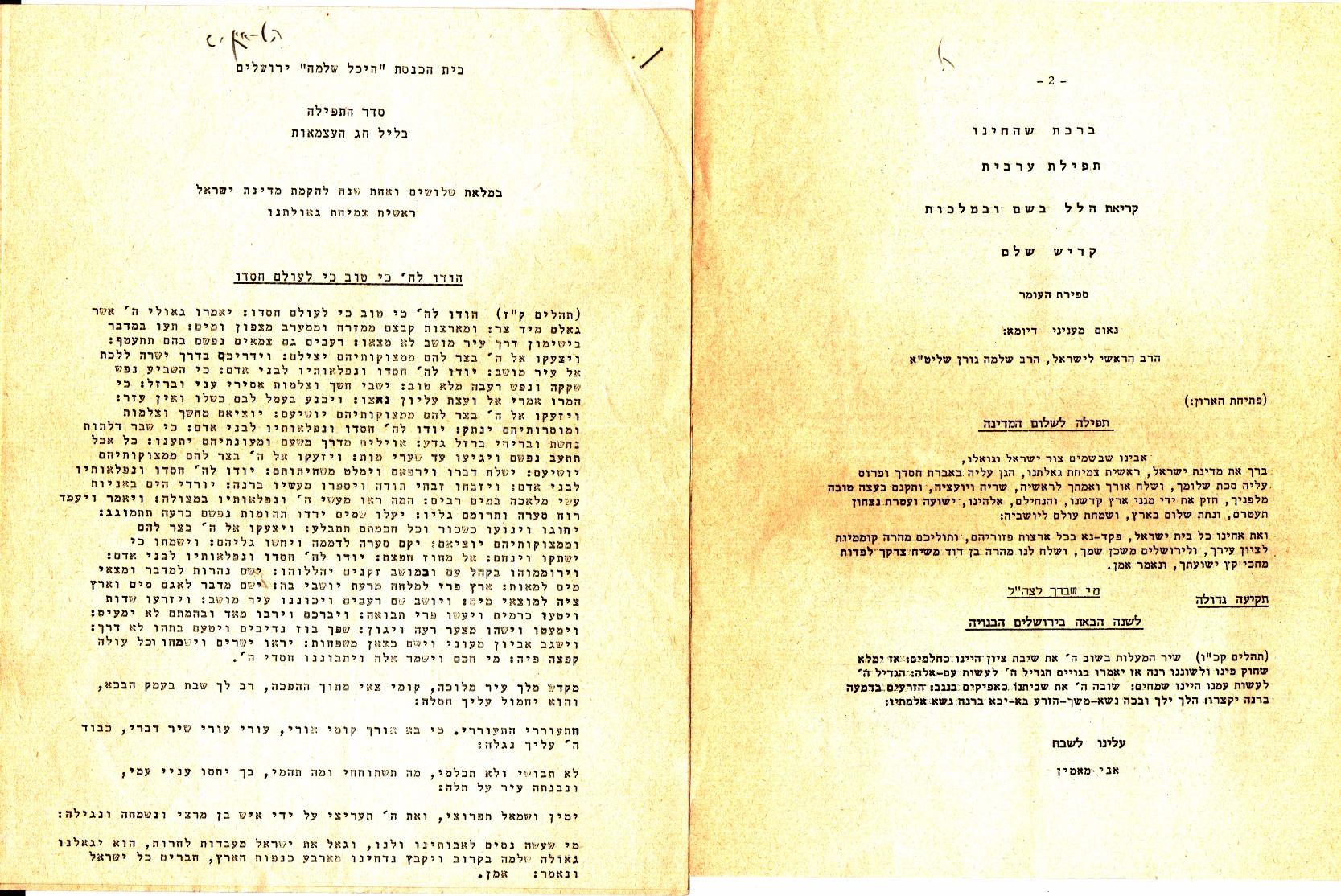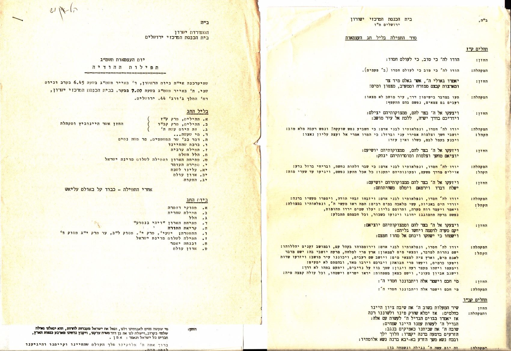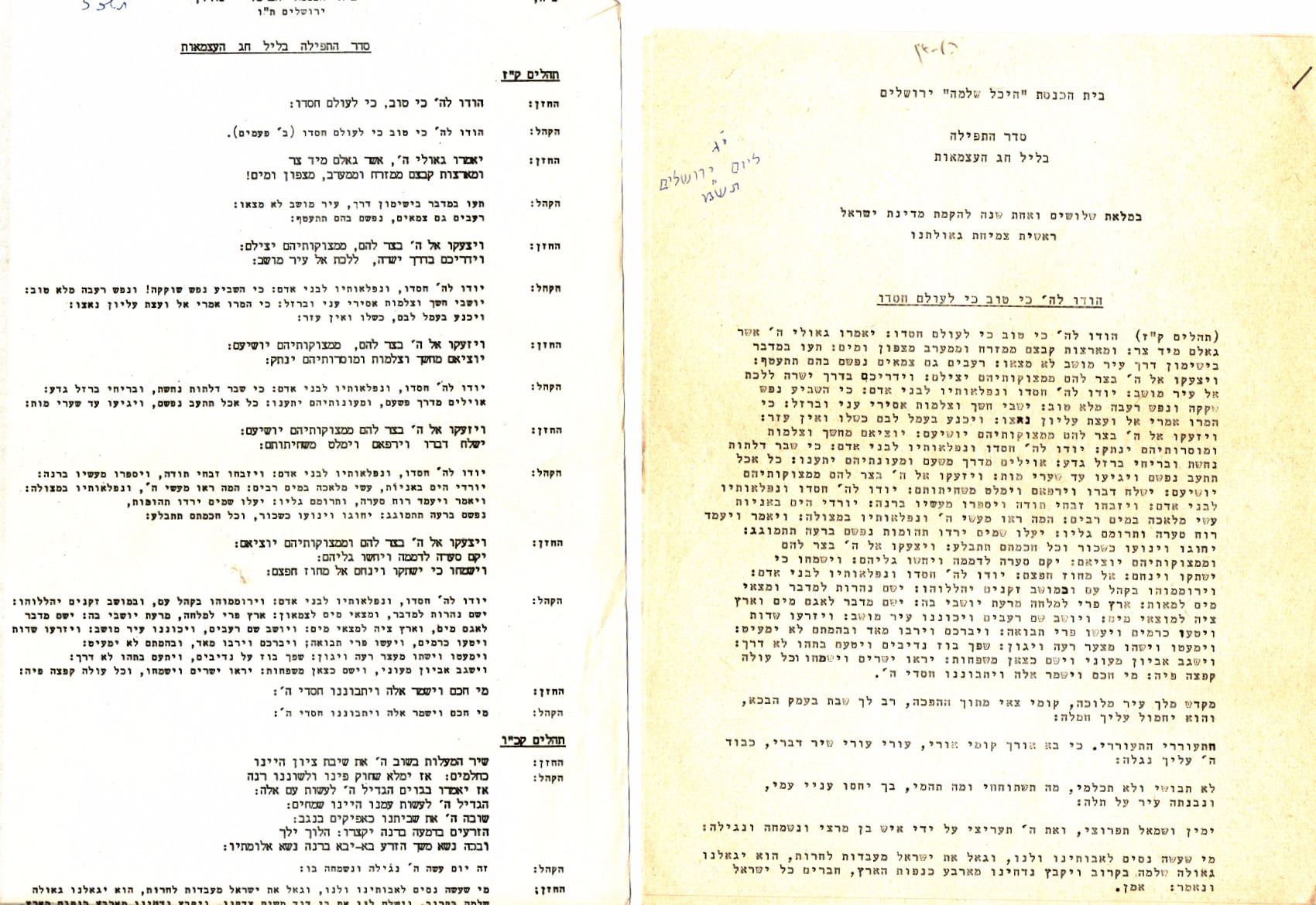 Hodaya prayers for the Israeli Day of Independence - Yeshurun ??Synagogue Jerusalem, 1960s and 1970s, a collection of 24 different kinds of Hodaya prayers, stencil prints or printed by typewriter. There are many identical from one specific year and others. The years are inscribed with pen in the upper leaves in most prayers. Good condition: slight yellowing, minor tears to margins of some of the prayers.