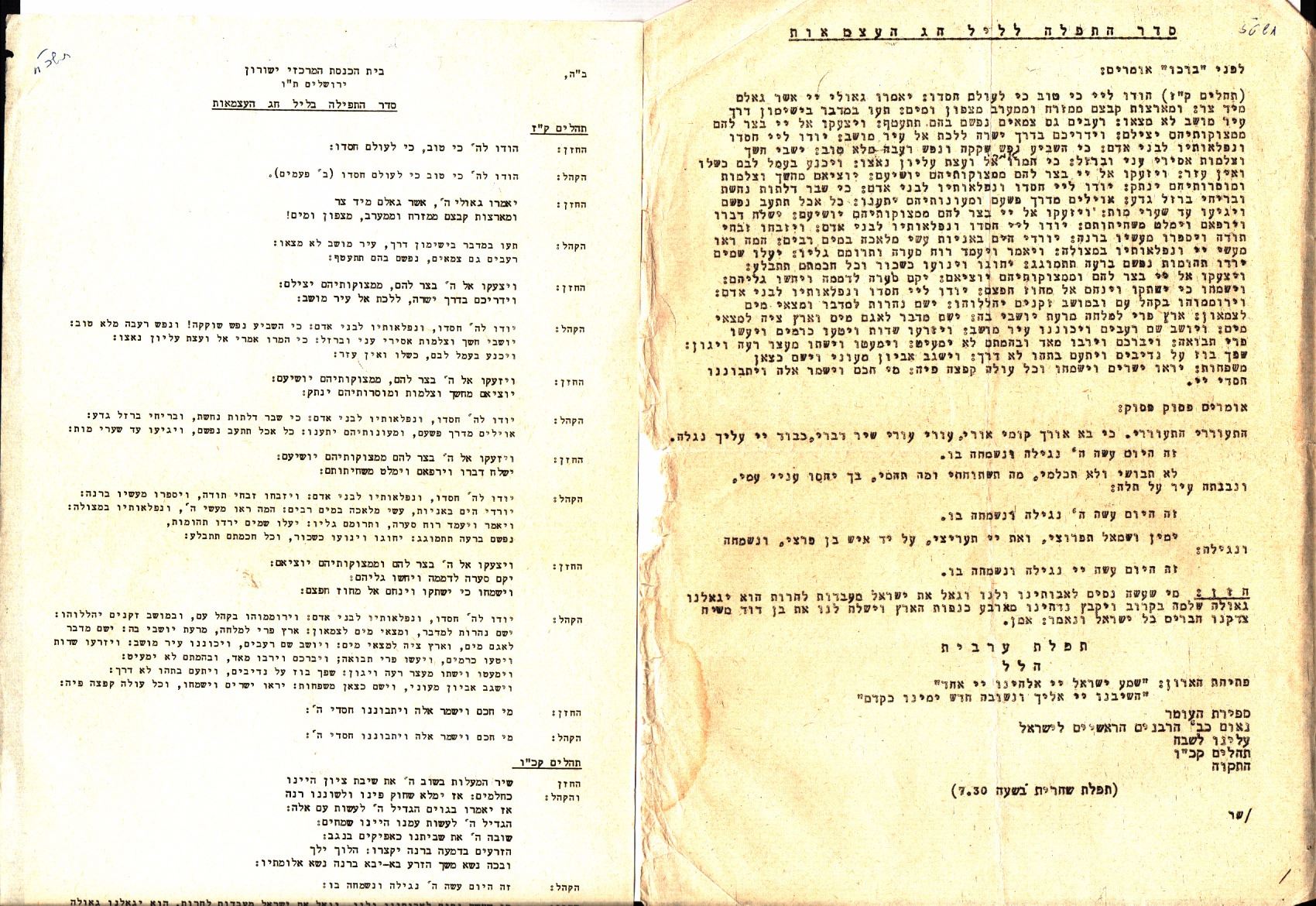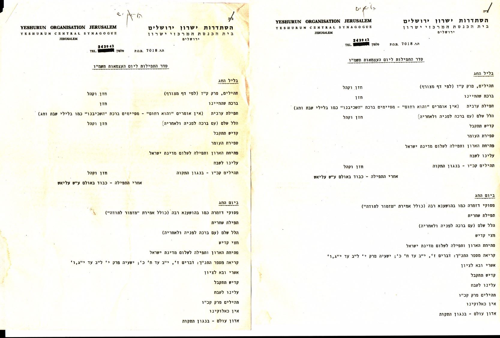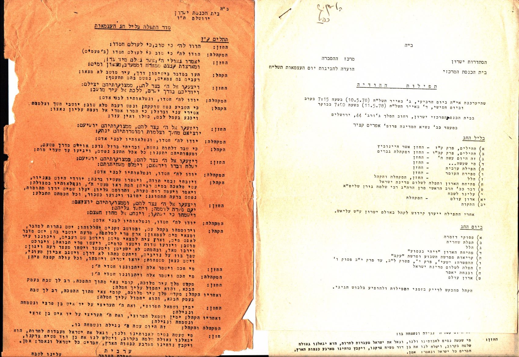 Hodaya prayers for the Israeli Day of Independence - Yeshurun ??Synagogue Jerusalem, 1960s and 1970s, a collection of 24 different kinds of Hodaya prayers, stencil prints or printed by typewriter. There are many identical from one specific year and others. The years are inscribed with pen in the upper leaves in most prayers. Good condition: slight yellowing, minor tears to margins of some of the prayers.