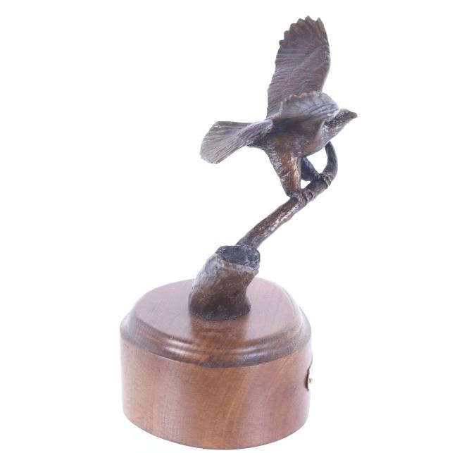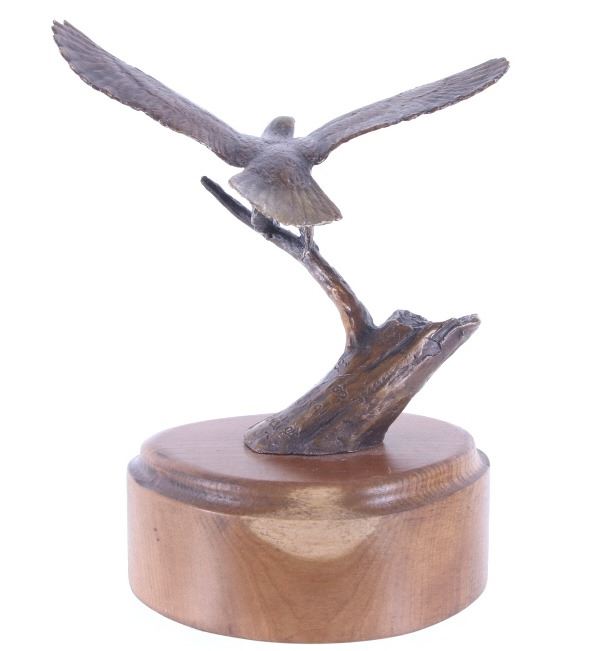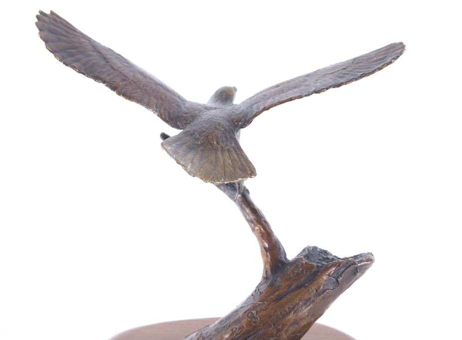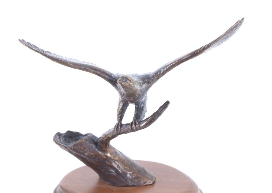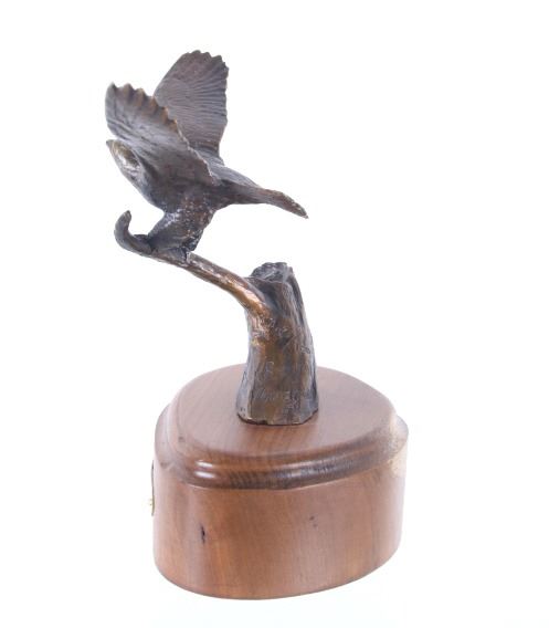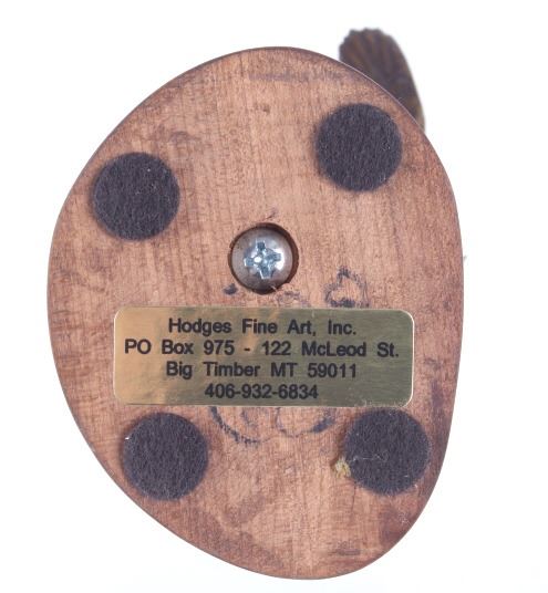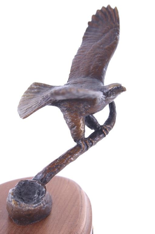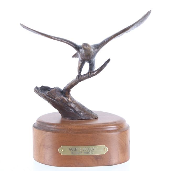 Featured in this lot is this is this bronze called "Golden Descent," by Montana artist Dave Hodges born in 1949 and circa 1991. This bronze sculpture features a bald eagle on a branch and is mounted on a hardwood shield with a plaque that reads as follows: "Golden Descent" by Dave Hodges. The bronze is inscribed with 90/100 - 1991 - Hodges and shows the artist hallmark next to the copyright symbol. Dave Hodges, a Big Timber Montana artist, graduated from MSU in 1979. In 1982, he began his professional career as a bronze sculptor and continues successfully in that field to this time. The condition of this bronze is good with no obvious signs of damage and in good overall condition. The measurements of this bronze is 6 1/4" x 5 1/8" x 3 1/2".