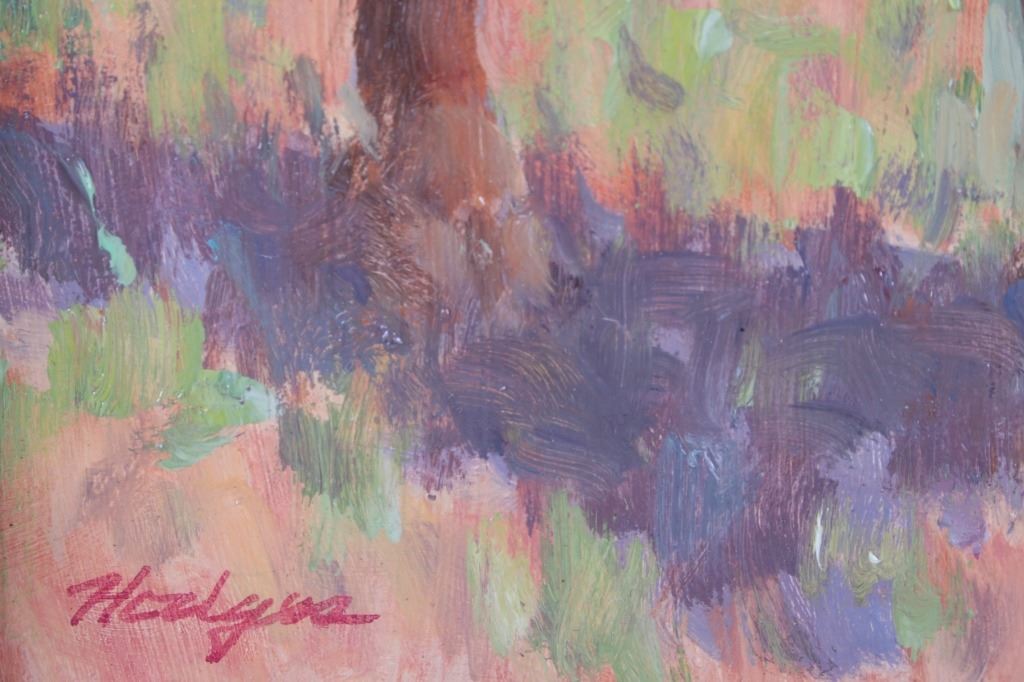 Featured in this lot is this oil-on-board called "Hello World" by David Hodges (1949 -). Dave Hodges, a Big Timber Montana artist, graduated from MSU in 1979. In 1982, he began his professional career as a bronze sculptor and continues successfully in that field to this time. The painting is of a young calf standing in the pasture, looking head long at the viewers. The frame shows professional construction from Colorado Framesmith. The condition of this oil-on-board is good, with no obvious signs of damage. The measurements of this framed oil-on-board are 17 3/4" x 14 3/4" and the visible art measures 11 3/4" x 8 3/4".