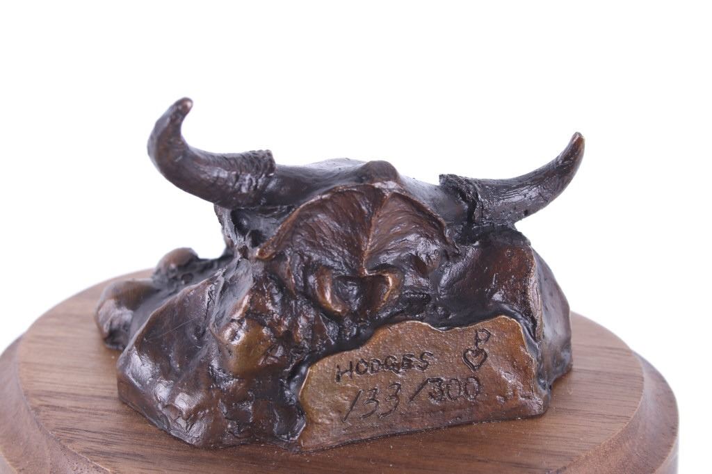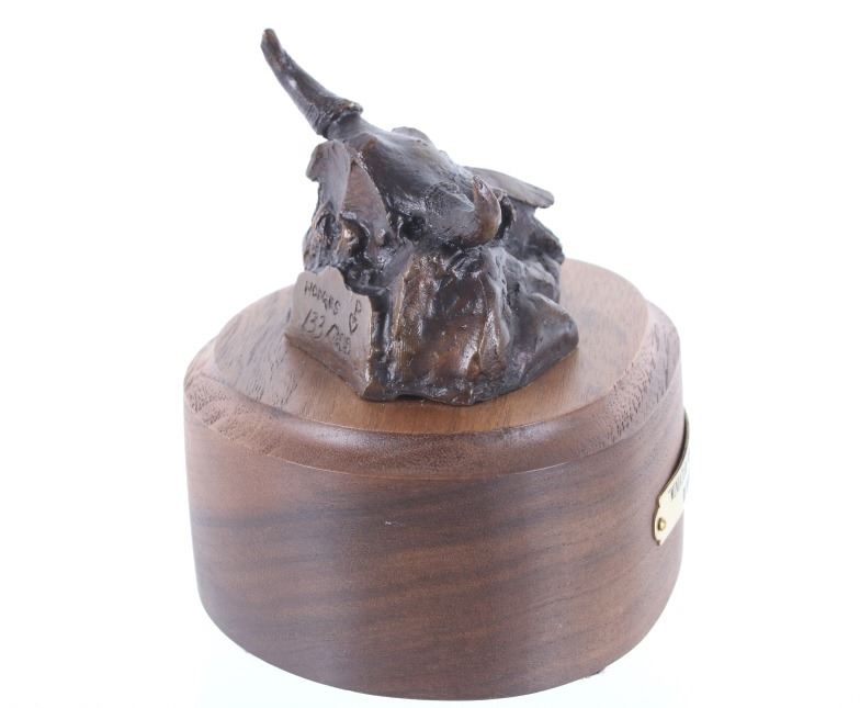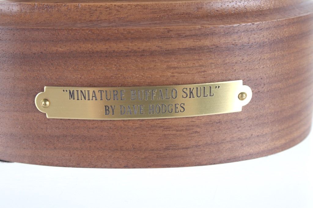 Featured in this lot is this bronze sculpture called "Miniature Buffalo Skull" from Montana artist Dave Hodges (born in 1949). This bronze is a miniature buffalo skull sculpture and features the artist’s signature on the back of the bronze; it is numbered 133/300. The sculpture is mounted on a polished hardwood shield. Dave Hodges, a Big Timber Montana artist, graduated from MSU in 1979. In 1982, he began his professional career as a bronze sculptor and continues successfully in that field to this time. The condition of this bronze is good, showing no obvious signs of damage. The measurements of this bronze are 4 1/8" x 5" x 4".