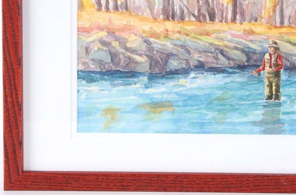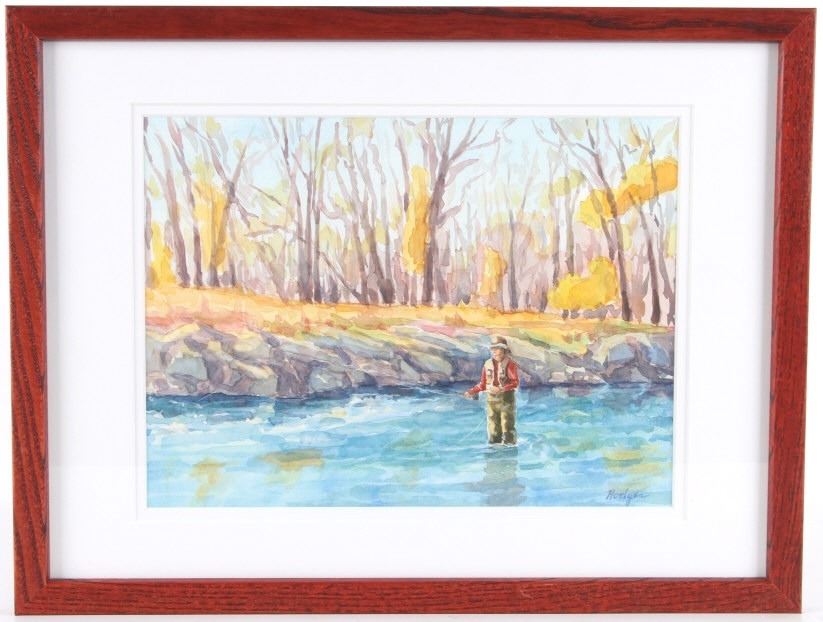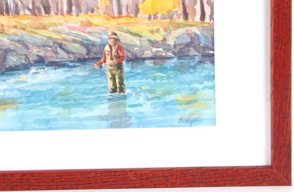 Featured in this lot is this watercolor called "Streamer Fishing" by Hodges, Dave (1949 - ). Dave Hodges, a Big Timber Montana artist, graduated from MSU in 1979. In 1982, he began his professional career as a bronze sculptor and continues successfully in that field to this time. The painting features a fishing scene of a man fly fishing in a river with a forest in the background. The condition of this framed watercolor is good with no obvious signs of damage and in good overall display condition. The measurements of this framed watercolor are 13 1/4" x 17 1/4" and the visible art measures 8 1/2" x 11 1/2".