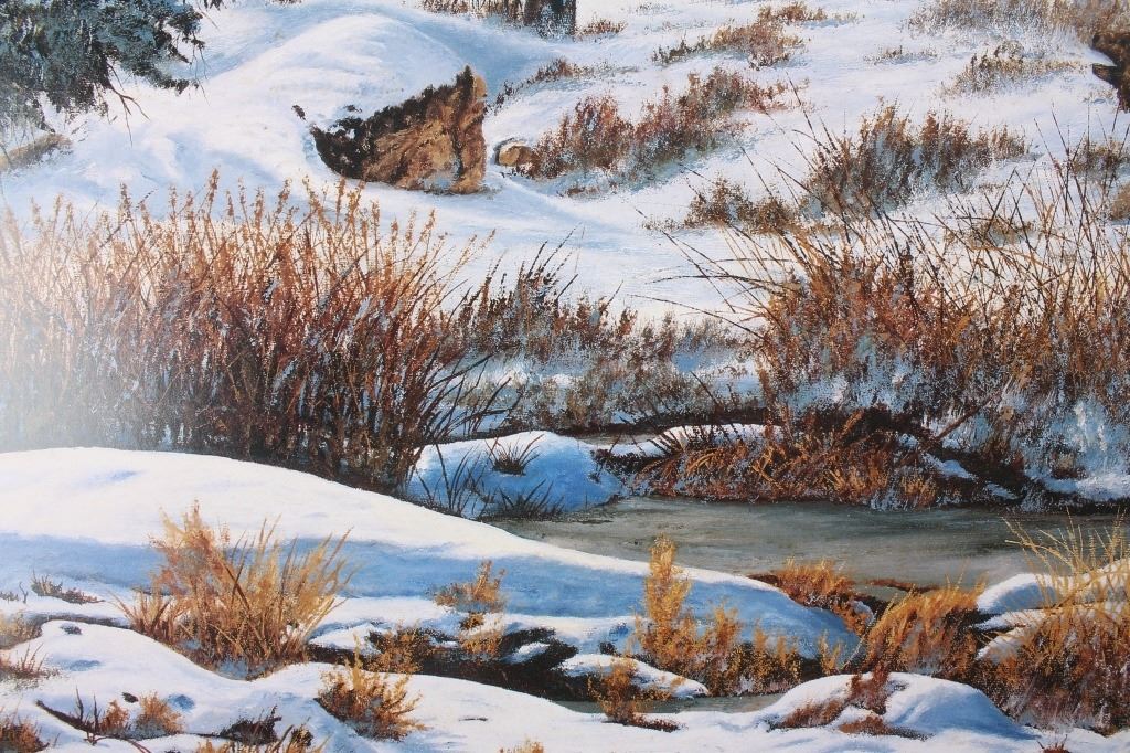 For your consideration is this collection of 25 lithographs called "The Bugler," by Montana artist William Hoffman (1924-1995). The scene show a majestic elk on the far side of a wintry creek with the tree line not far away; and a magnanimous looming mountain range behind. William Hoffman was an American painter known for his depictions of Pacific seascapes and the American West. Born in 1924 in Montana, Hoffman was a self-taught artist who found painting late in life. He decided to pursue a career in art after visiting a gallery for the first time. The condition of these prints is good in like new condition with no visible signs of damage to any of the prints. The measurements of this 20" x 26" and the visible art measures 18" x 24".
