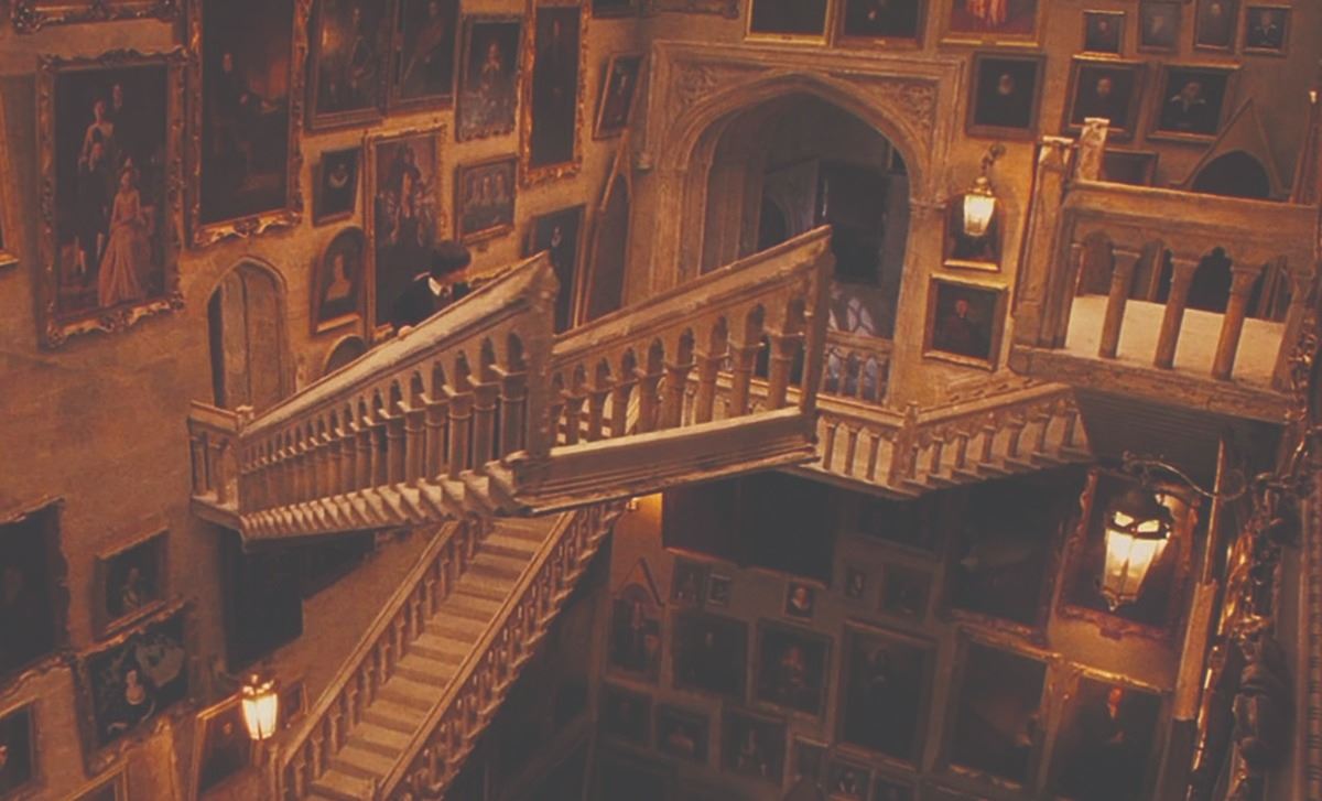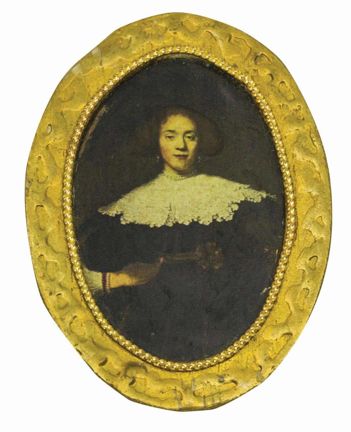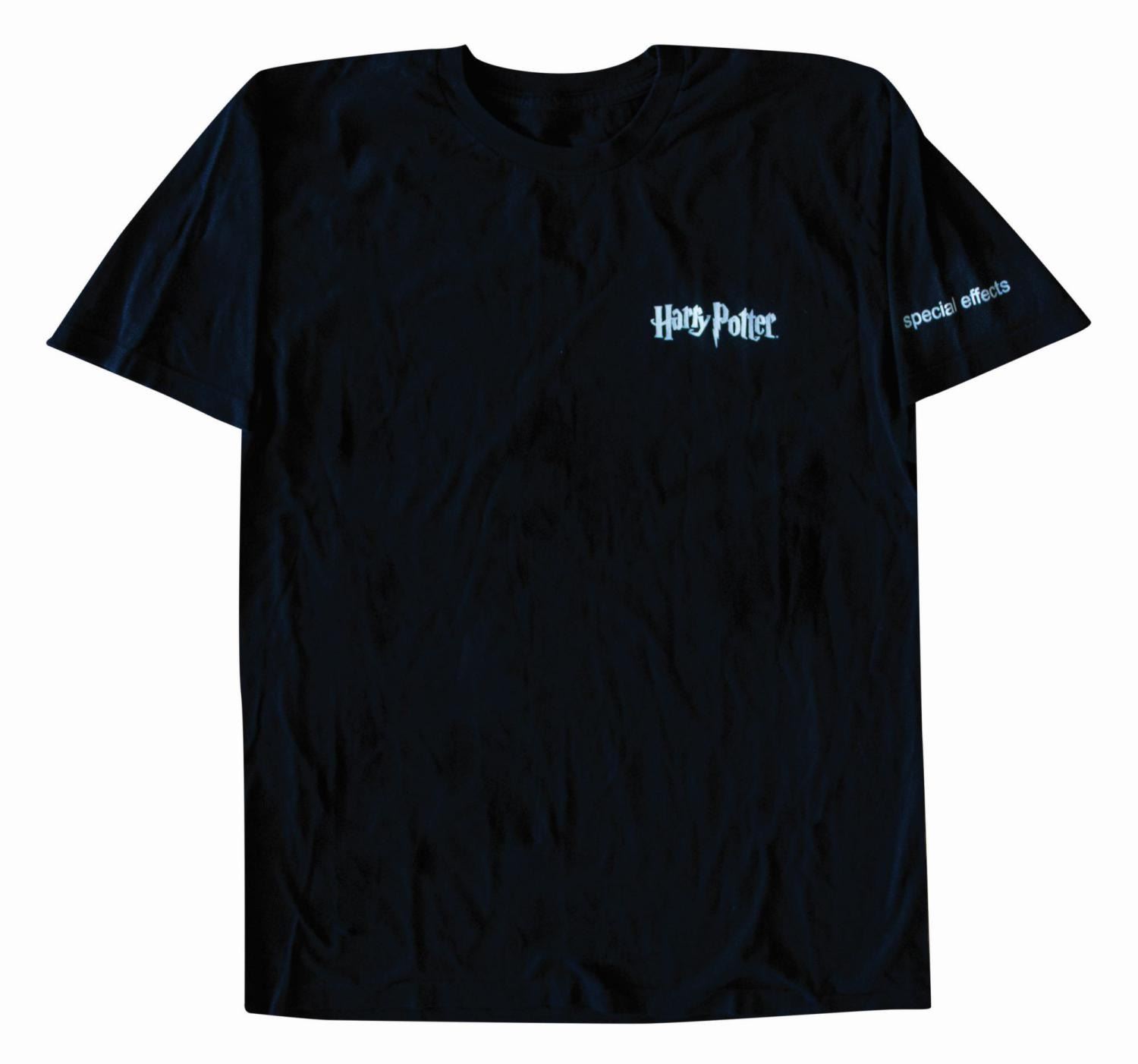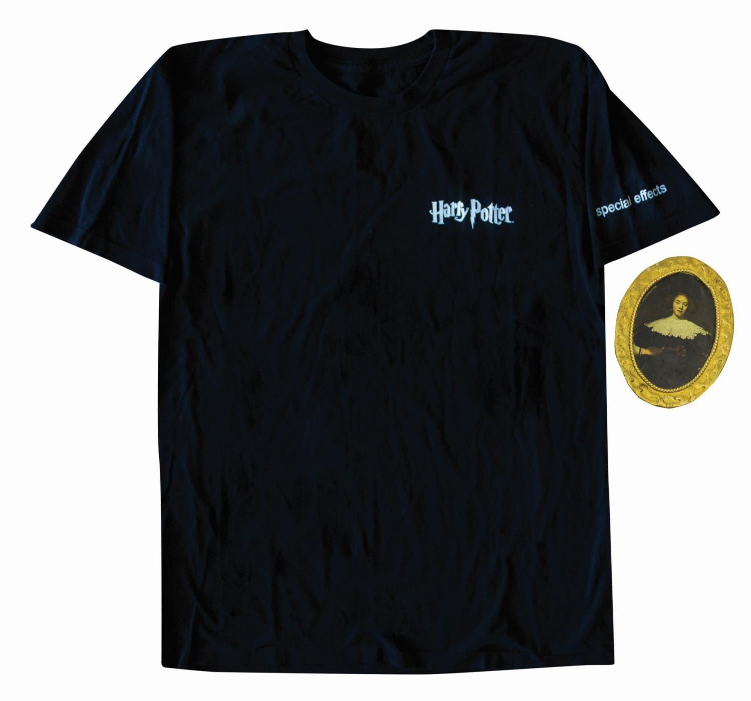 (WB, 2001) A miniature prop painting from the grand staircase of Hogwarts in the Harry Potter franchise. Portions of the scenes involving the magical, MC Escher-style staircase were accomplished with special effect shots of a model miniature, and this prop painting was one of the many wizard portraits that lined on the walls. The painting consists of a color print in a paper frame embellished with gold paint and fabric cord. The painting measures 4.25"x3.25 and is in very good condition with minor surface wear. Also included is a Special Effects crew t-shirt from the production. A size L, the black t-shirt is in fine, unworn condition.