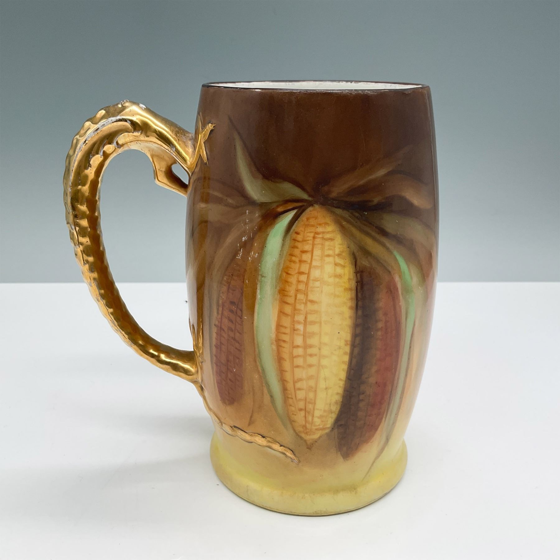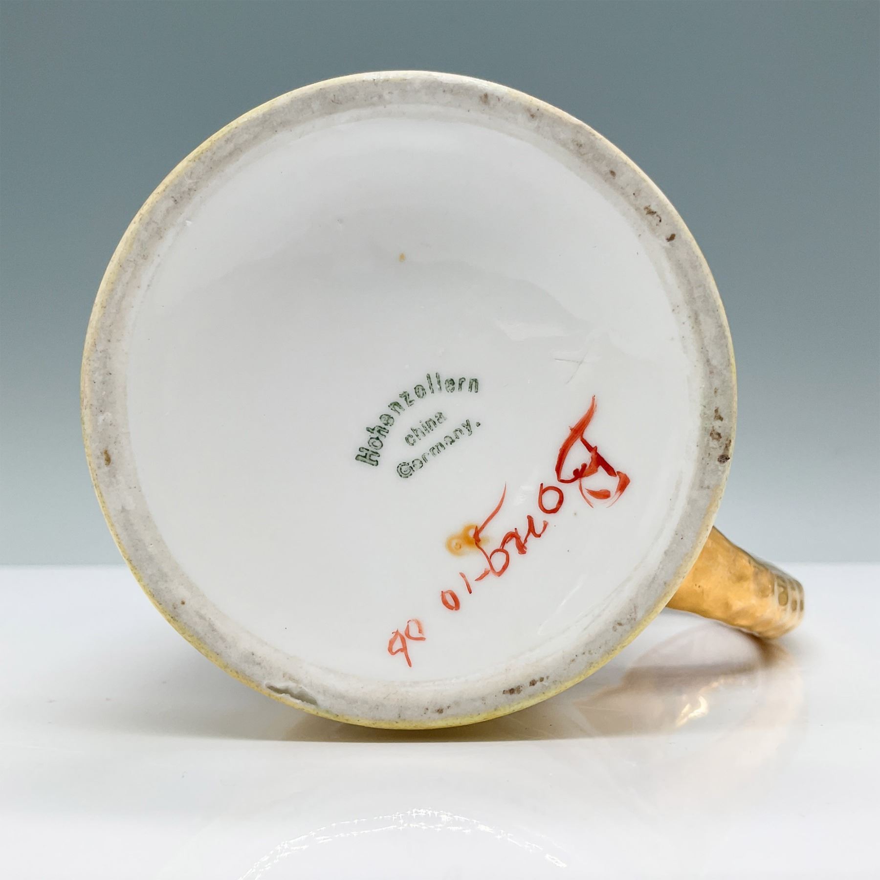 Unique Hohenzollern China mug featuring a detailed dragon-shaped handle with a golden finish and a vibrant hand-painted corn motif. Made in Germany, this piece showcases intricate artistry and vibrant coloring, characteristic of early 20th-century craftsmanship. The bottom bears the Hohenzollern China Germany backstamp, confirming its authenticity. Measuring 6"H, this collectible mug is a striking example of fine china artistry and an excellent addition to any collection.