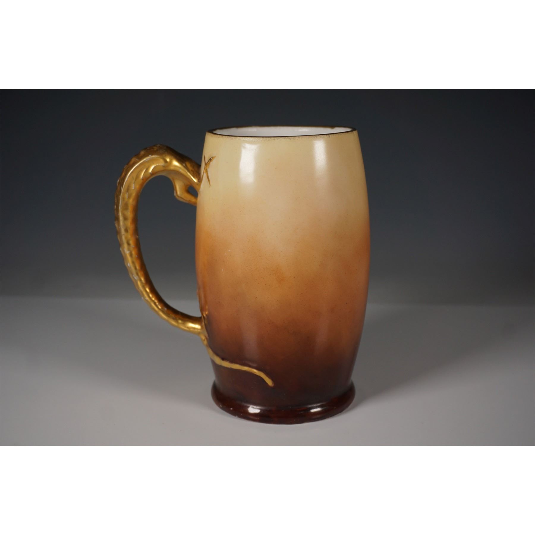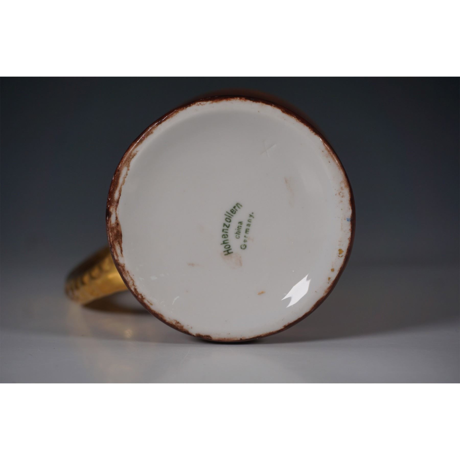 This charming Hohenzollern German porcelain mug features a finely painted scene of a monk drinking from a large cup, surrounded by grapes in a basket. The mug is enhanced with a unique, sculpted dragon handle in gilt finish. The detailed hand-painted artwork of the monk captures a warm, nostalgic tone, while the ornate handle adds a touch of whimsical elegance. The underside is marked with the Hohenzollern China Germany backstamp.