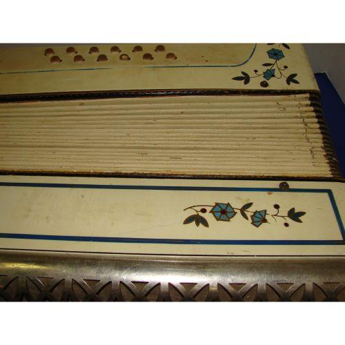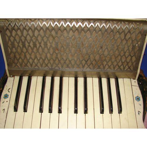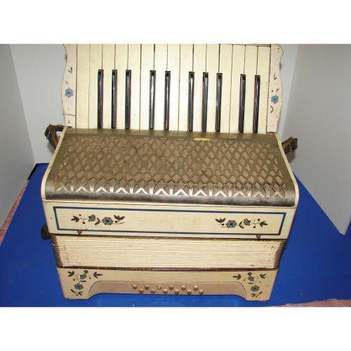 12 bass 25 treble. White case with chrome grill & inlaid flowers. Shows wear. 13 1/2 Keyboard x 17x8". Crack in key. Weight 15 lb. Good condition.