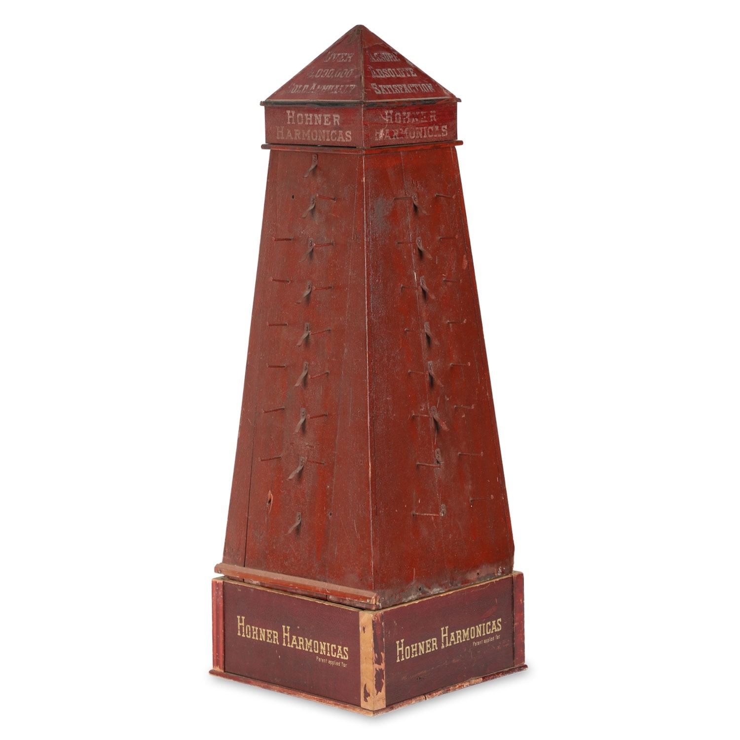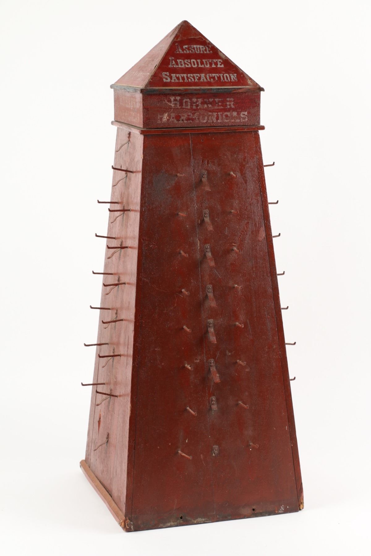 Painted wood obelisk for counter-top display and storage of harmonicas. Condition: Fair. Base originally contained a mechanism that, when wound, rotated the above portion. Several pieces of mounting hardware have either become broken or missing. Selling price graphics worn or omitted. 31" x 10.5" x 10.5"