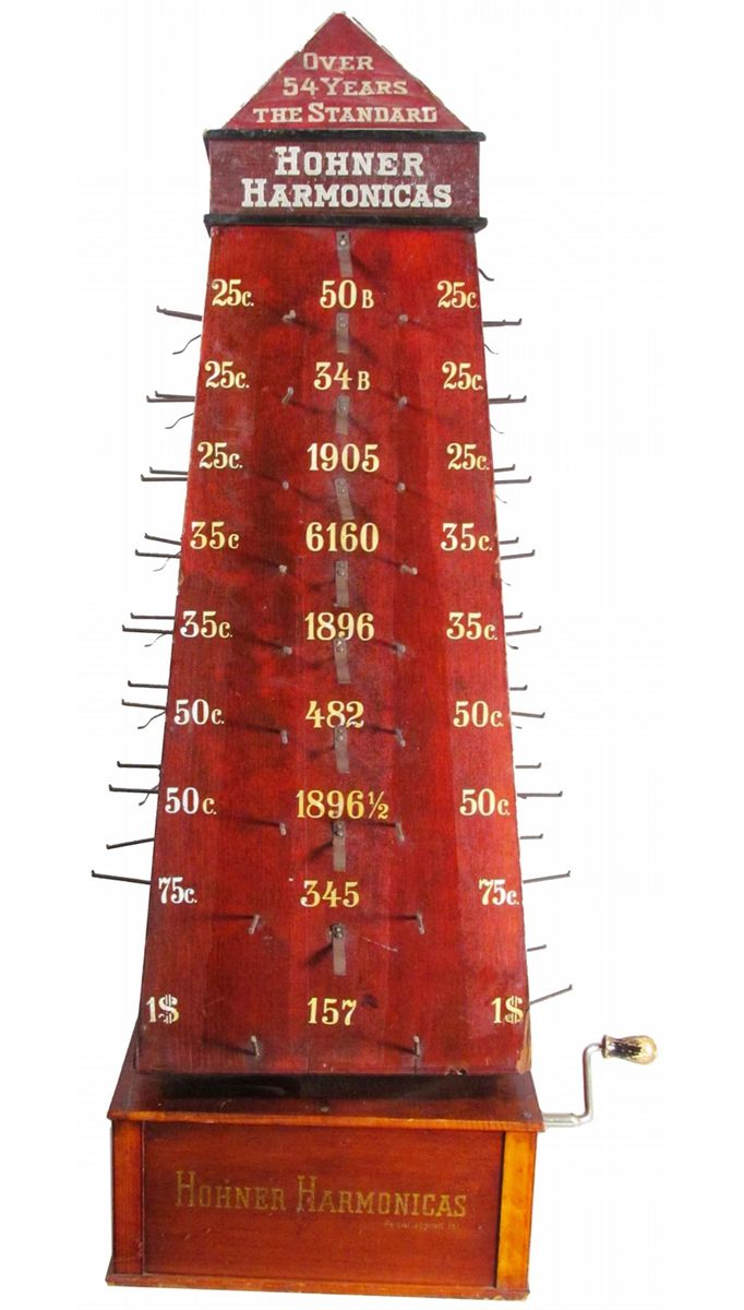 Hohner Harmonica Wood Wind-up Display with hand crank. Very good working condition. 11 inch square base by 32 inches tall.