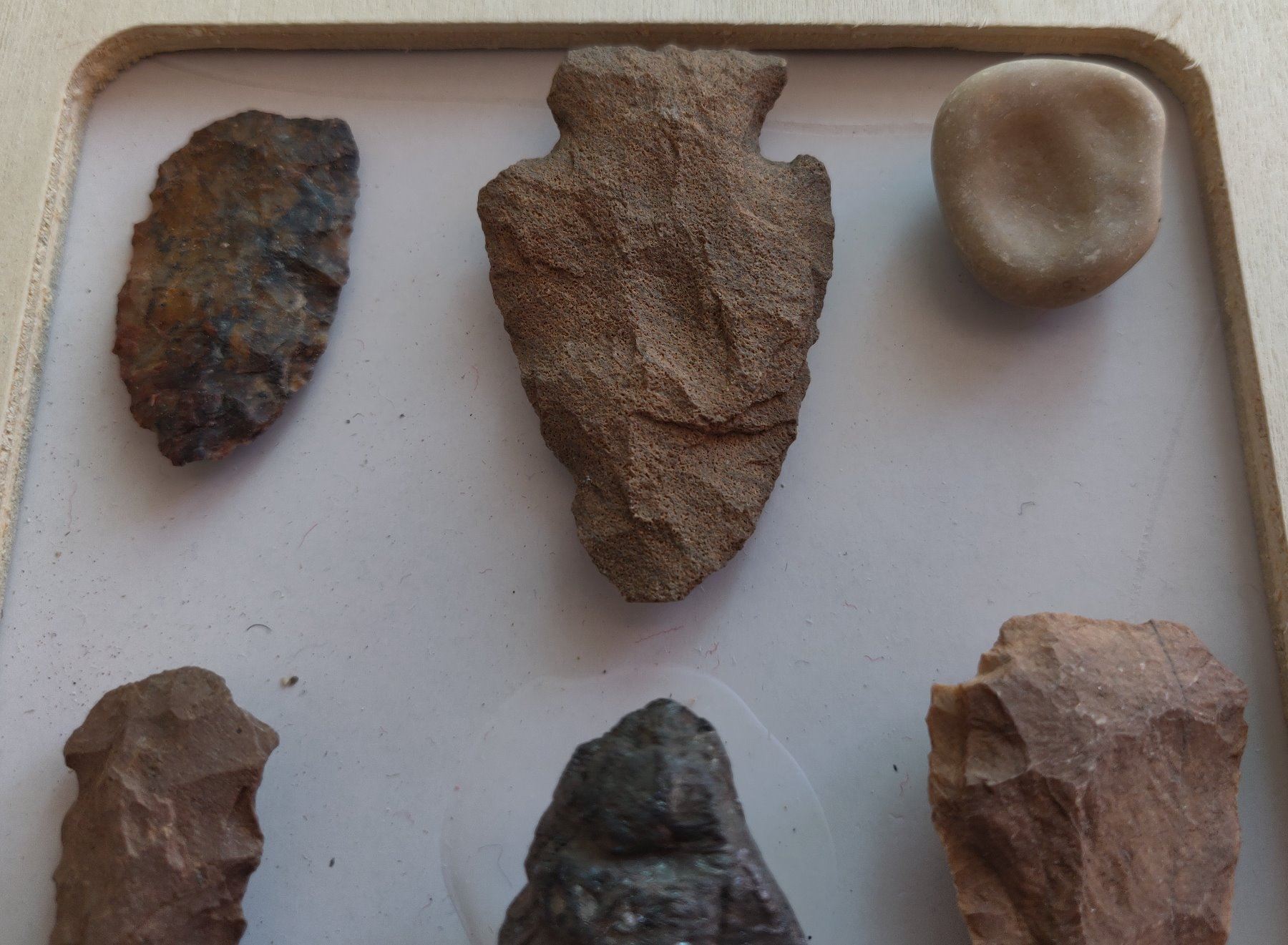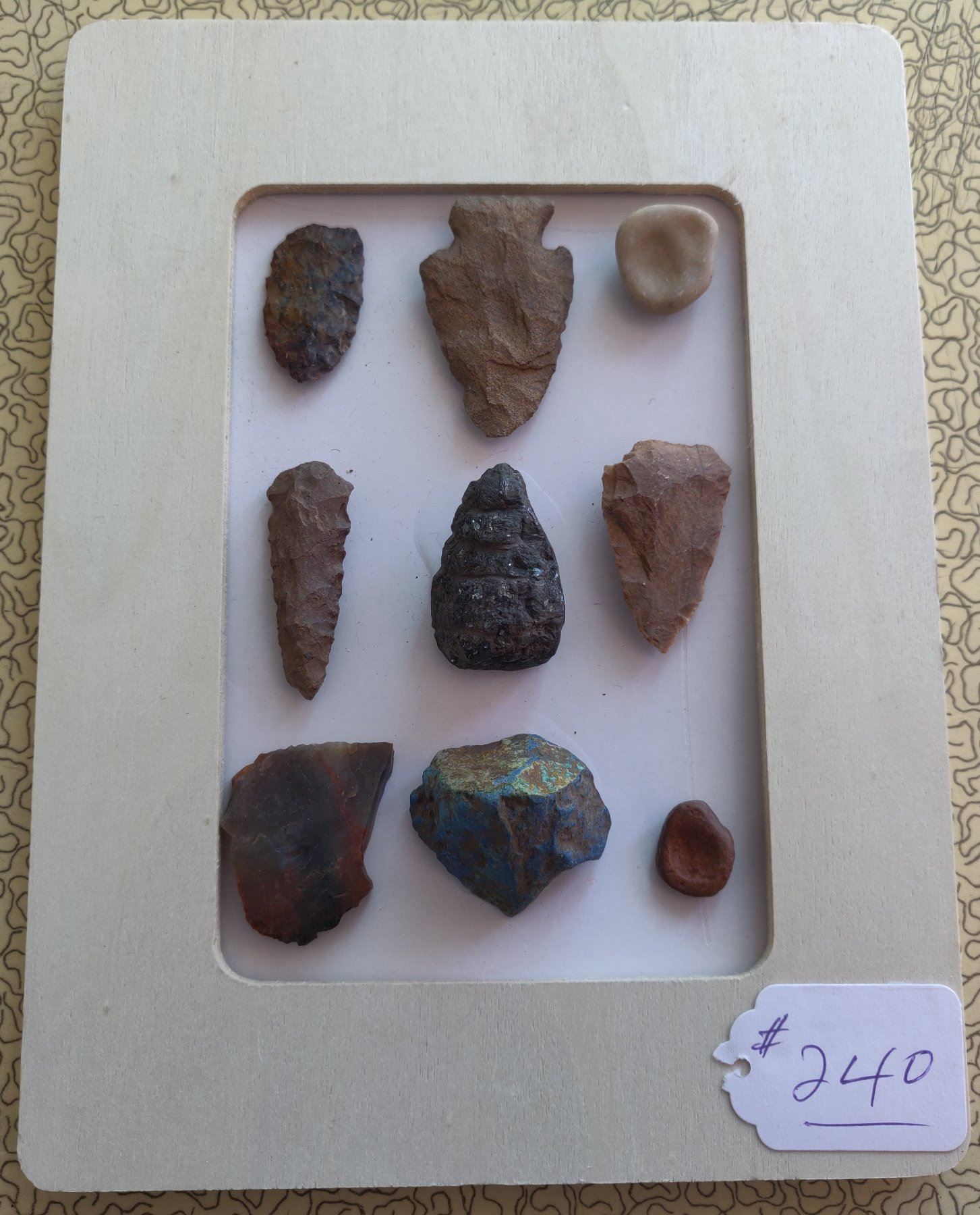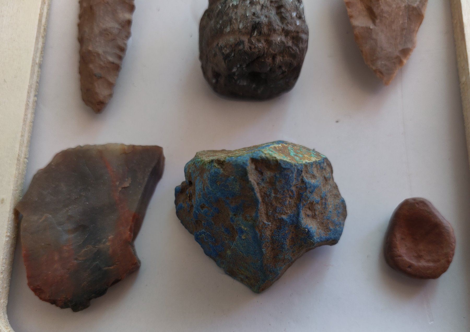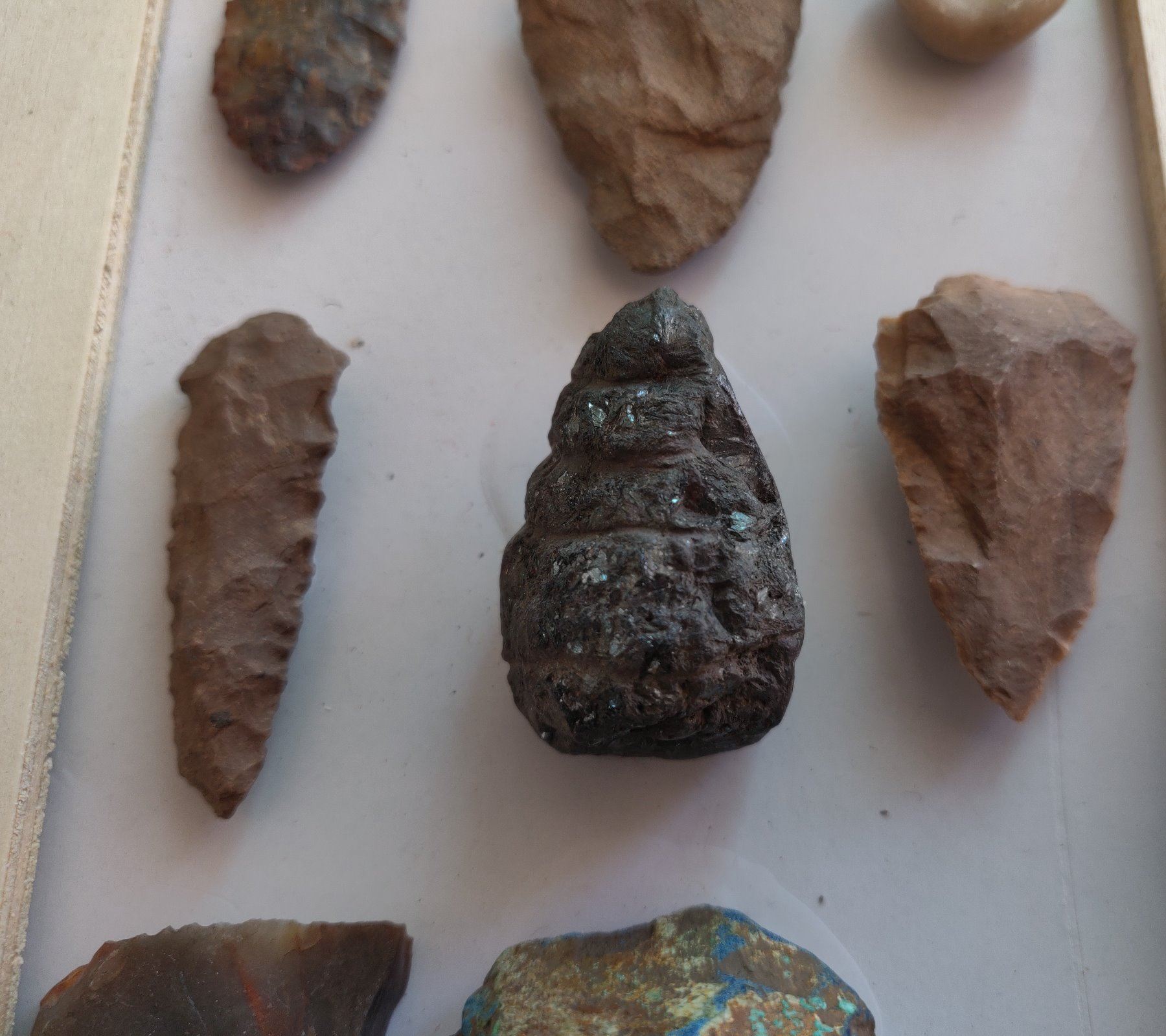 Hohokam Artifact Collection, pre-historic items. Made of azurite, hematite and chert, the largest measures 1 3/4". Ajo, Pima County, Arizona. Central figure is a hematite rattlesnake rattle. Condition: As found, see images. Shipping: $20.00 w/insurance and signature, due to value.