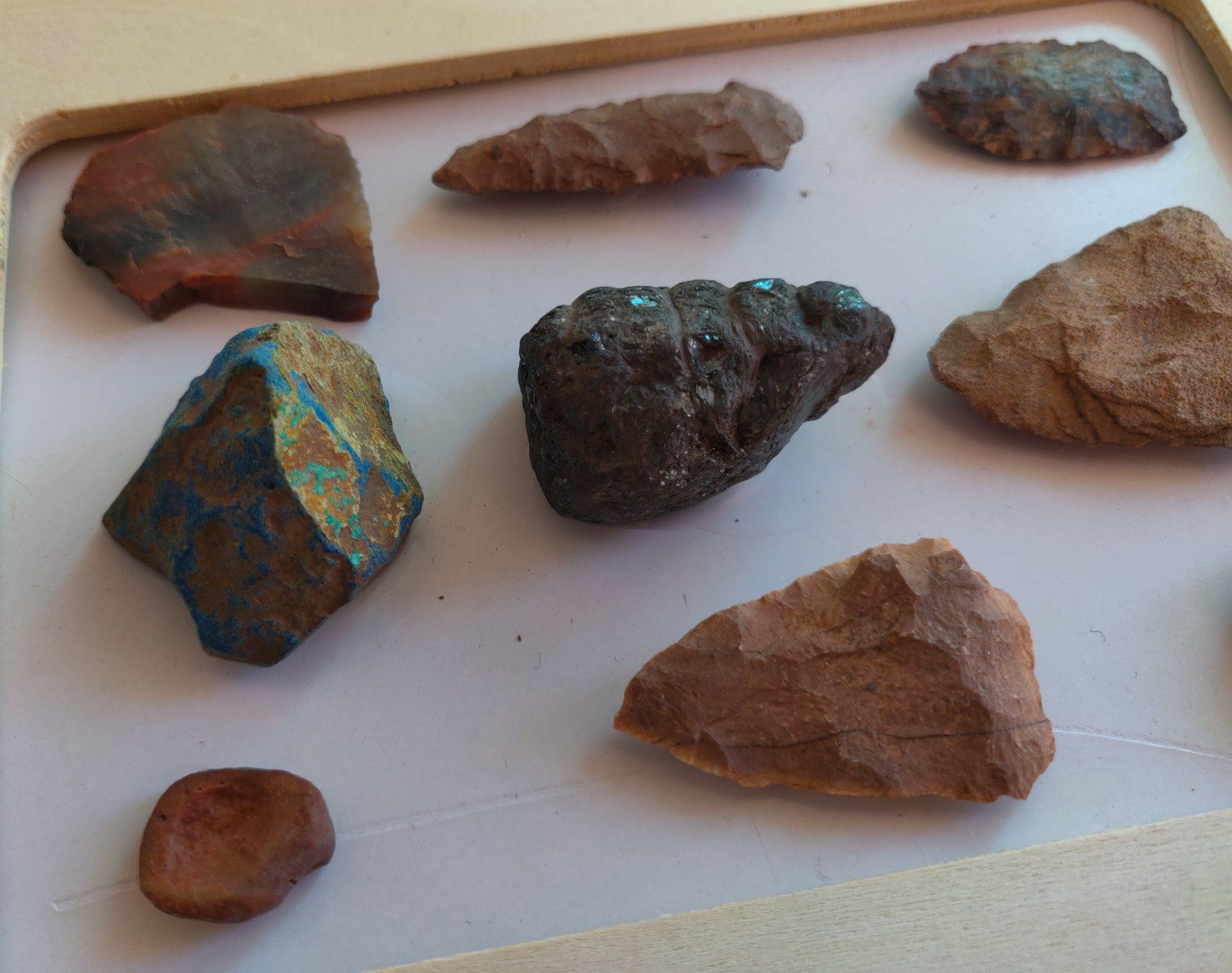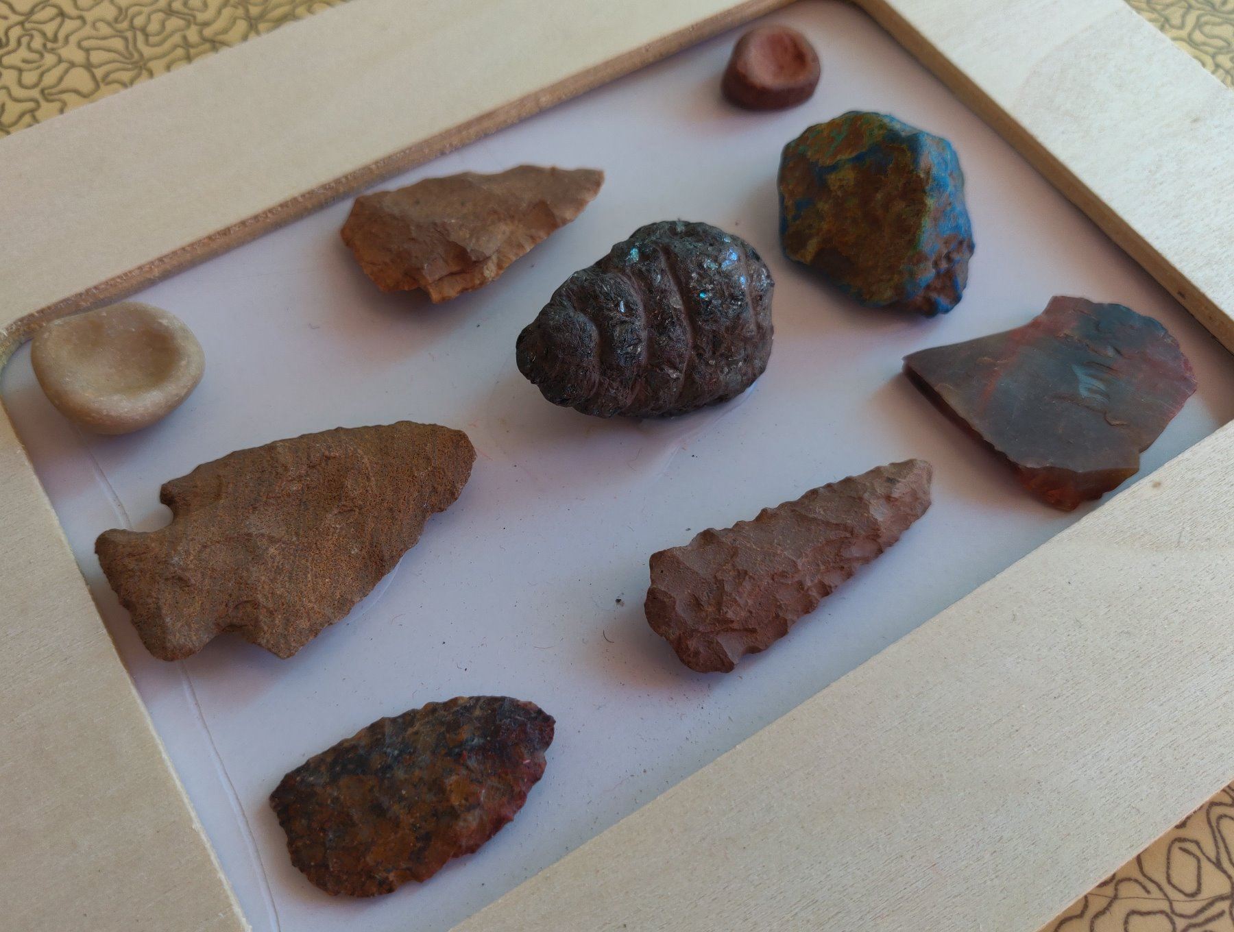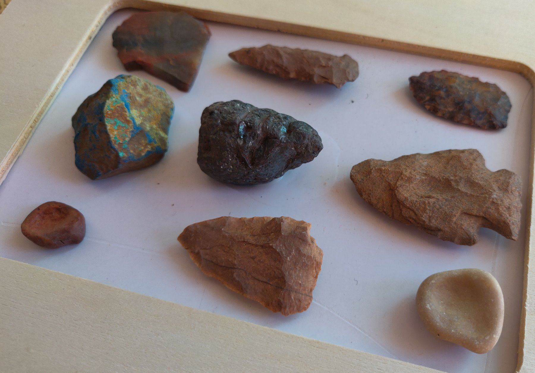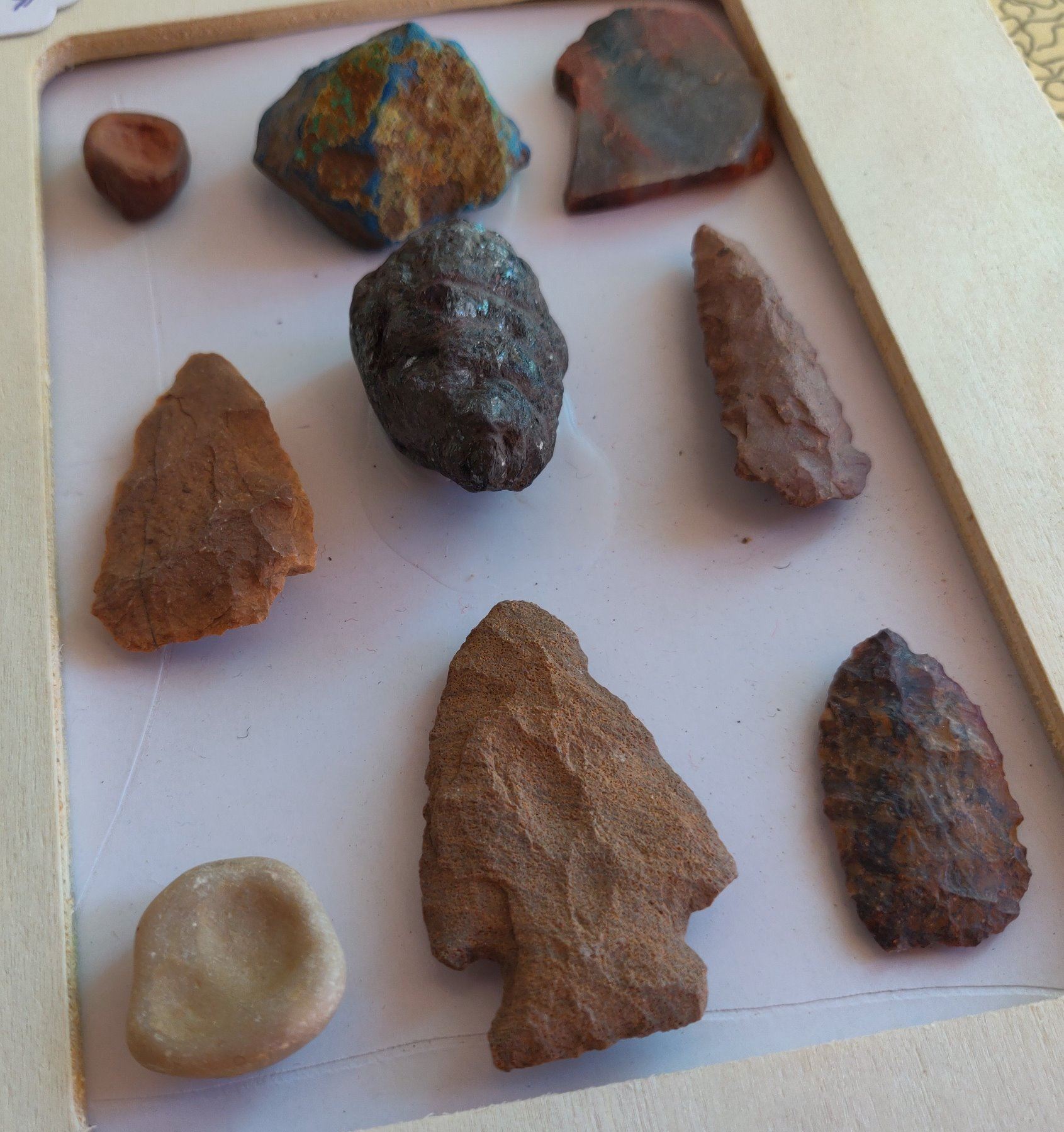 Hohokam Artifact Collection, pre-historic items. Made of azurite, hematite and chert, the largest measures 1 3/4". Ajo, Pima County, Arizona. Central figure is a hematite rattlesnake rattle. Condition: As found, see images. Shipping: $20.00 w/insurance and signature, due to value.