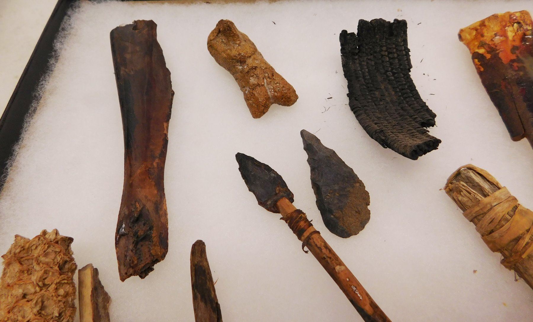 Hohokam Collection, pre-historic items. Made of corn, stone, wood, bone, clay and rawhide, the items measure 1" to 11.5". Hohokam, Arizona. Rare clay doll, arrowshaft straightener, arrow foreshaft, bone awl. Cave find near Tucson, Arizona in the 1950s on private land. Condition: As found, see images. Shipping: $24.50 w/insurance and signature.