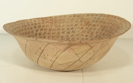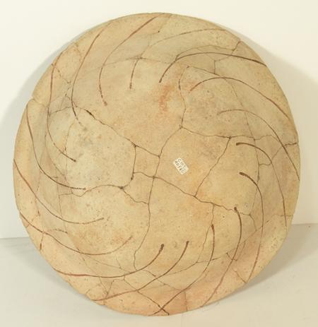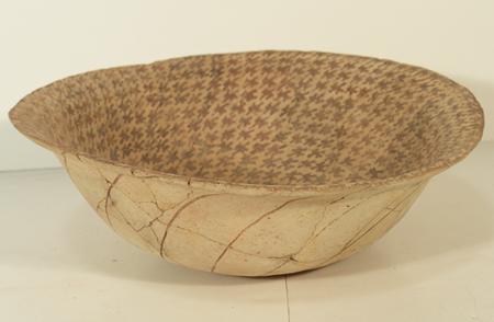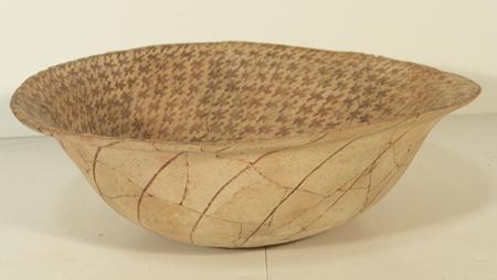 Outstanding widely flared red-on-buff bowl with hundreds of bird-like figures on interior. Purchased from Pueblo One in 1982 for $700. Marked "unrestored". 5" x 13" diameter