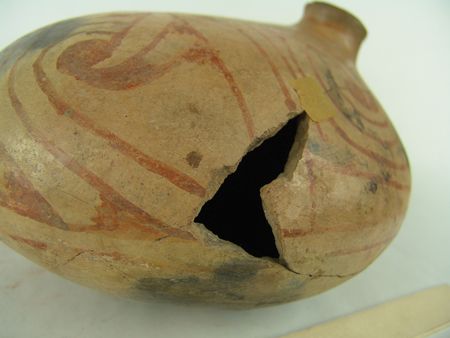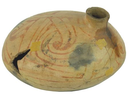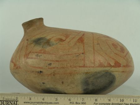 Prehistoric, Very rare red-on-buff single spout canteen or urinal with curvilinear designs. This is glued, but not restored and has one missing piece. Very good overall condition. 7" x 10" x 8-1/2"