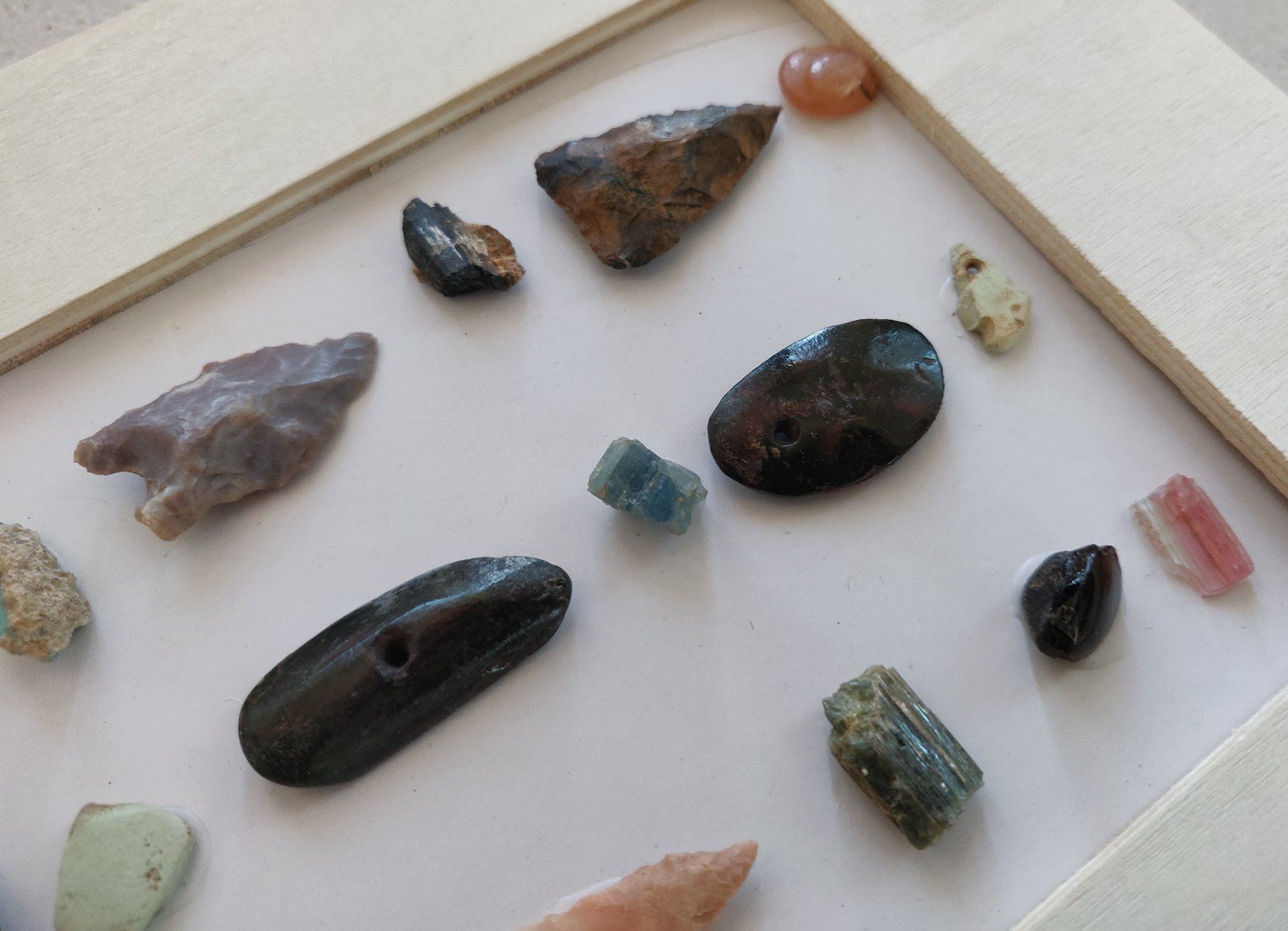 Hohokam Relics Collection, pre-historic items. Made of cannel coal, jasper, turquoise and other minerals, the longest measures 1 1/4". Ajo, Pima County, Arizona. 3 cannel coal traded pendants from the Hopewell culture, points and other artifacts included. Condition: Good, as found, see images. Shipping: $21.00 w/insurance and signature, due to value.