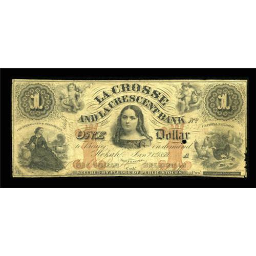 <B>Hokiah, MN- La Crosse and La Crescent Bank</B></I> $1 Jan. 21, 1859 G2a Hewitt D1-1b<BR> The Haxby plate note from this very rare bank and a note listed as Rarity-7 in the estimable new Hewitt Minnesota reference. This is the variety with the error "Regr." (short for Register) engraved in the plate instead of "Audr" (Auditor). This error was corrected on this note in pen by the Deputy Auditor. <B>Fine,</B></I> with a small punch hole and a tiny bit of roughness at the bottom right side. <BR><BR><b>Shipping:</b> Coins & Currency (<a target="_blank" href="http://www.heritageauctions.com/common/shipping.php">view shipping information</a>)