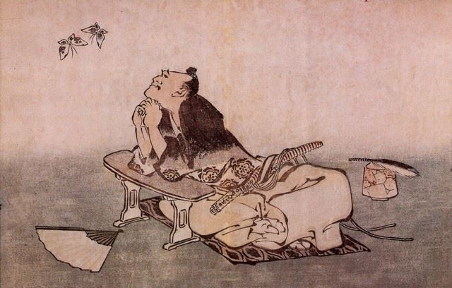 Artist: Katsushika Hokusai - Title: A Philospher Looking at Two Butterflies - Medium: Fine Art Giclee on Canvas - Image Size: Approximately 20.5 inches x 32 inches - Unframed on Unstretched Canvas - Biography: ( c. 31 October 1760 - 10 May 1849), known simply as Hokusai, was a Japanese artist, ukiyo-e painter and printmaker of the Edo period. Born in Edo (now Tokyo), Hokusai is best known as author of the woodblock printseries Thirty-six Views of Mount Fuji which includes the internationally iconic print, The Great Wave off Kanagawa.