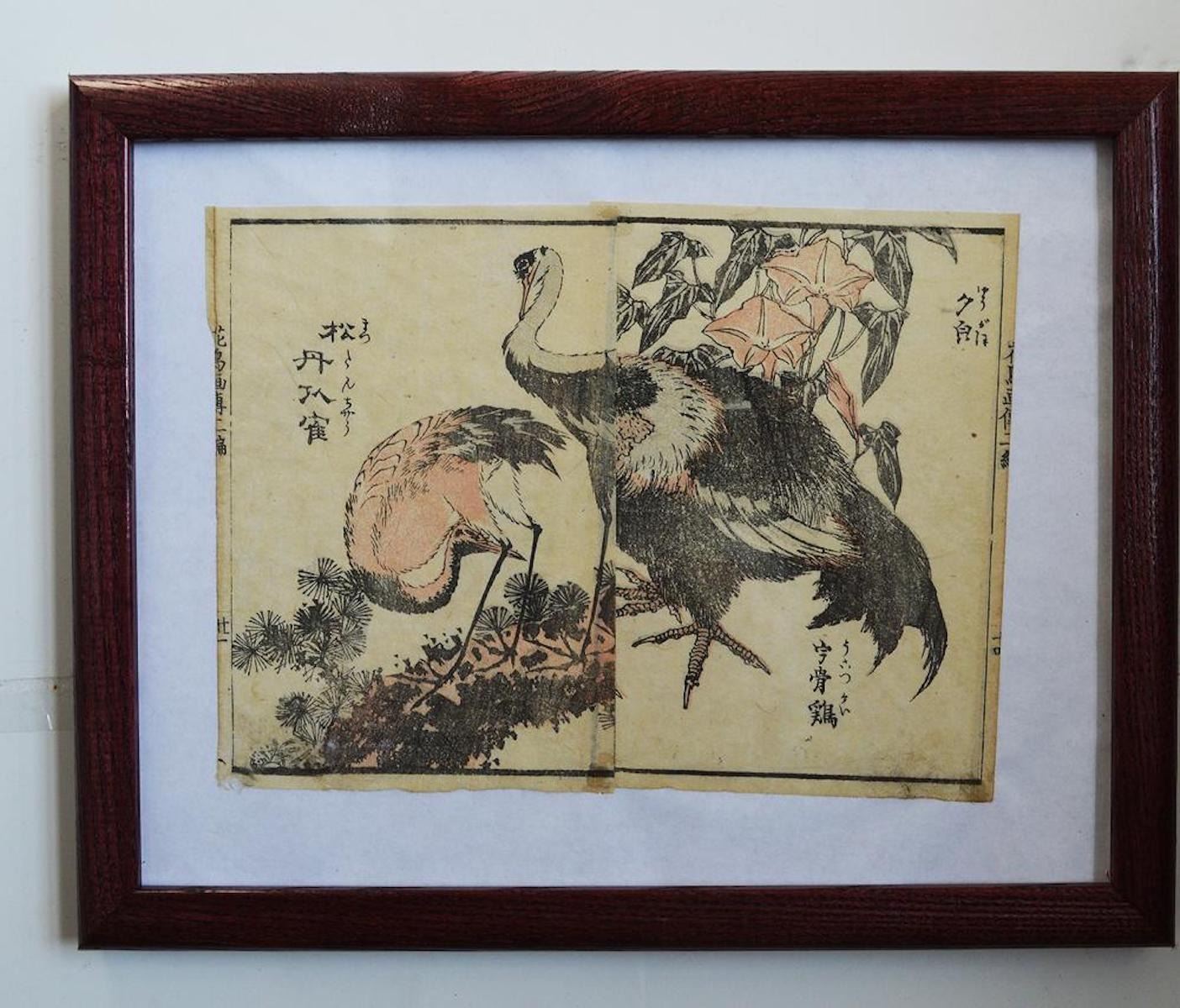 Hokusai - "Geese" - WOODBLOCK PRINT. FRAMED WOODBLOCK PRINT.Japanese Woodblock Print Book Kwacha Garden. By Katsushika Taito, (Hokusai) 1848THESE ARE ORIGINAL JAPANESE WOODBLOCK PRINT BY HOKUSAIL FROM HIS BOOK MENTIONED ABOVE. THEY WERE PRINTED IN 1848. THE IMAGES CONTAINS TWO PAGES PUT TOGETHER TO FORMED ONE IMAGE. THE APROXIMATE SIZE OF THE IMAGE IS 8.5 X 6. THEY ARE IN A FRAMED THAT MEASURES APROXIMATELY 10 X 13. THESE FRAMES CAN BE MOUNTED ON A WALL OR SIT ON A TABLE.THESE MAKE A PERFECT INEXPENSIVE HOLIDAY PRESENT FOR A JAPANESE WOODBLOCK PRINT.PLEASE NOTE THAT SHIPPING WILL BE $25 FOR A USPS PRIORITY MAIL INSURED.