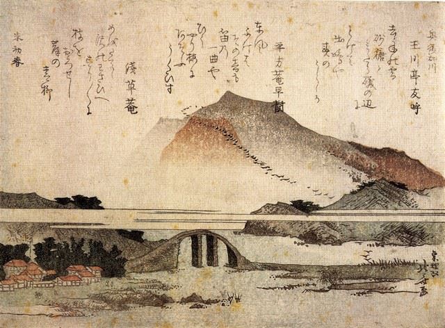 Artist: Katsushika Hokusai - Title: Mountain Landscape with a Bridge - Medium: Fine Art Giclee on Canvas - Image Size: Approximately 23.5 inches x 32 inches - Unframed on Unstretched Canvas - Biography: ( c. 31 October 1760 - 10 May 1849), known simply as Hokusai, was a Japanese artist, ukiyo-e painter and printmaker of the Edo period. Born in Edo (now Tokyo), Hokusai is best known as author of the woodblock printseries Thirty-six Views of Mount Fuji which includes the internationally iconic print, The Great Wave off Kanagawa.