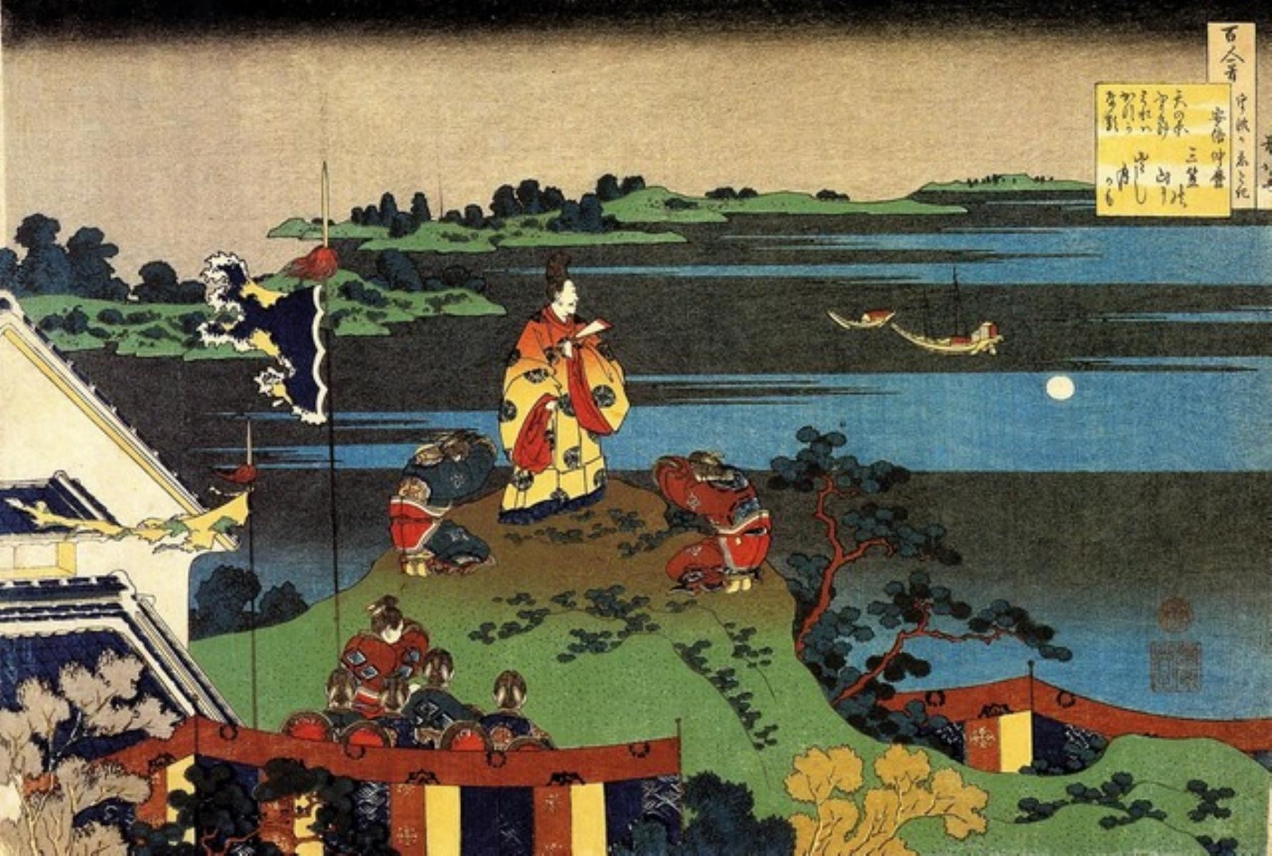 Artist: Katsushika Hokusai - Title: Nakamaro Looking at the Moon - Medium: Fine Art Giclee on Canvas - Image Size: Approximately 21.5 inches x 32 inches - Unframed on Unstretched Canvas - Biography: ( c. 31 October 1760 - 10 May 1849), known simply as Hokusai, was a Japanese artist, ukiyo-e painter and printmaker of the Edo period. Born in Edo (now Tokyo), Hokusai is best known as author of the woodblock printseries Thirty-six Views of Mount Fuji which includes the internationally iconic print, The Great Wave off Kanagawa.