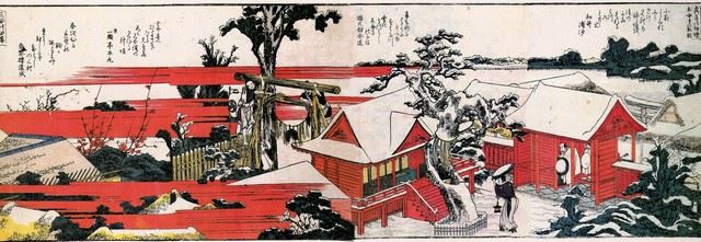 Artist: Katsushika Hokusai - Title: Red Houses - Medium: Fine Art Giclee on Canvas - Image Size: Approximately 11 inches x 32 inches - Unframed on Unstretched Canvas - Biography: ( c. 31 October 1760 - 10 May 1849), known simply as Hokusai, was a Japanese artist, ukiyo-e painter and printmaker of the Edo period. Born in Edo (now Tokyo), Hokusai is best known as author of the woodblock printseries Thirty-six Views of Mount Fuji which includes the internationally iconic print, The Great Wave off Kanagawa.