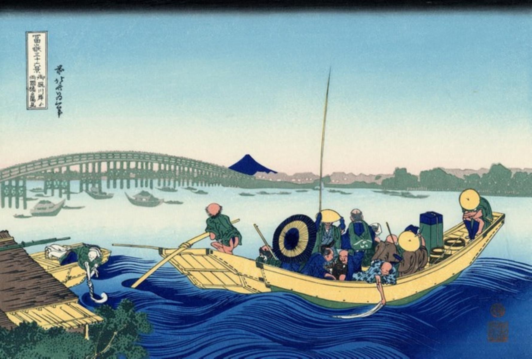 Artist: Katsushika Hokusai - Title: Sunset Across the Ryogoku Bridge - Medium: Fine Art Giclee on Canvas - Image Size: Approximately 21.5 inches x 32 inches - Unframed on Unstretched Canvas - Biography: ( c. 31 October 1760 - 10 May 1849), known simply as Hokusai, was a Japanese artist, ukiyo-e painter and printmaker of the Edo period. Born in Edo (now Tokyo), Hokusai is best known as author of the woodblock printseries Thirty-six Views of Mount Fuji which includes the internationally iconic print, The Great Wave off Kanagawa.