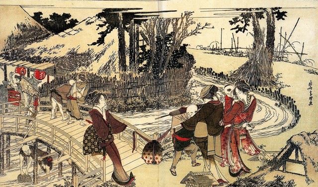Artist: Katsushika Hokusai - Title: Village Near a Bridge - Medium: Fine Art Giclee on Canvas - Image Size: Approximately 19 inches x 32 inches - Unframed on Unstretched Canvas - Biography: ( c. 31 October 1760 - 10 May 1849), known simply as Hokusai, was a Japanese artist, ukiyo-e painter and printmaker of the Edo period. Born in Edo (now Tokyo), Hokusai is best known as author of the woodblock printseries Thirty-six Views of Mount Fuji which includes the internationally iconic print, The Great Wave off Kanagawa.