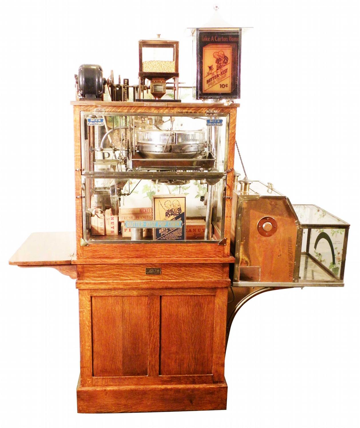 Holcomb and Hoke Popcorn Machine. Model 3E. The Cadillac of Holcomb & Hoke Popcorn machines. All Electric with a four-sided rotating sign and a side mounted Peanut Roaster. Quarter Sawn Oak Cabinet. Circa 1919. In Excellent Working Condition. The best one we have ever seen! 68 x 82 x 26 inches.