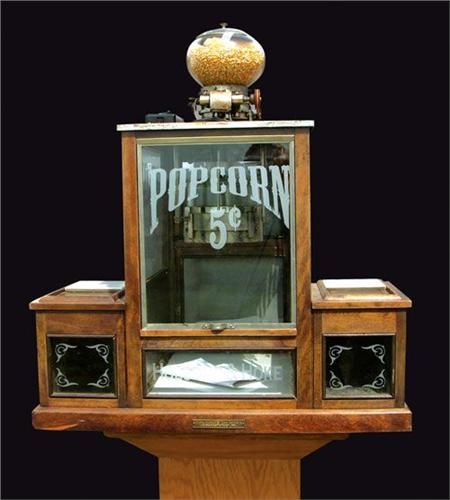 Holcomb and Hoke Popcorn Machine, table top model. Works with newly applied lettering. 34 X 29 1/2 X 21 1/2 inches.