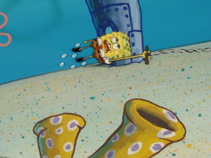 This original hand-painted background and animation cel are from the Nickelodeon TV show SpongeBob Squarepants. The story takes place under the deep blue sea in Bikini Bottom, where SpongeBob resides. SpongeBob, who is a yellow, porous sponge, is your typical happy-go-lucky character, as he is always cheerful and enjoys making people laugh. Patrick Star, SpongeBob's neighbor who is a starfish, is your average children's show idiot, as he boasts knowing nothing and is often getting himself into ridiculous situations. Between the homes of these two lies the home of the miserable Squidward, a squid, who is known for being grouchy and playing tricks on SpongeBob and Patrick. Both SpongeBob and Squidward work at the Krusty Krab, a fast food business run by the greedy money-loving Mr. Krabs, a crab, the arch rival of the evil, possibly misunderstood, Plankton. Another neighbor, Sandy Cheeks, an athletic squirrel who normally wears an astronaut's space suit, was introduced in "Tea at the Treedome." She spends most of her time inventing and experimenting. SpongeBob hold on.Original Production Background and Animated Cel Overall Size of Background: 10 1/2" x 14" Overall Size of the Cel: 10 1/2" x 12 1/2" Very good condition This is an original hand-painted cel set-up used in the production of an episode of "SpongeBob SquarePants." Each one-of-a-kind set-up represents a slight change in position of the characters. When individually photographed and projected in rapid succession, the images appear to move.