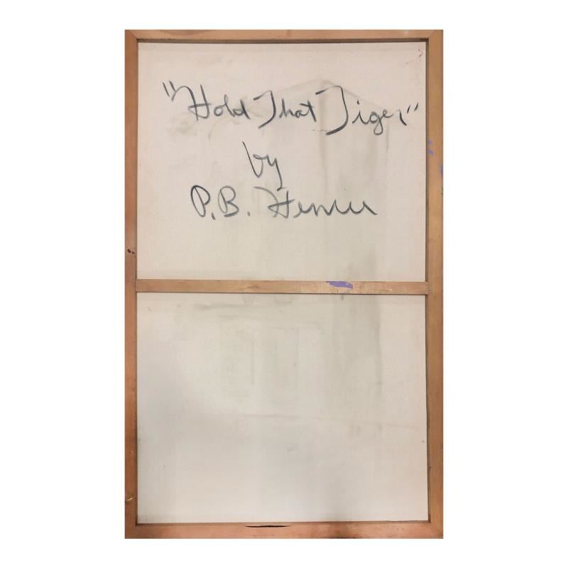 "Hold That Tiger" is an original oil painting on stretched canvas by Paul Blaine Henrie (1932-1999). The piece is hand signed by the artist and comes with a letter of authenticity. Please note that due to the age of this piece and the way it was stored, there are minor sings of wear, particularly on the corners and edges. Measures approximately. 48" x 30" (image).