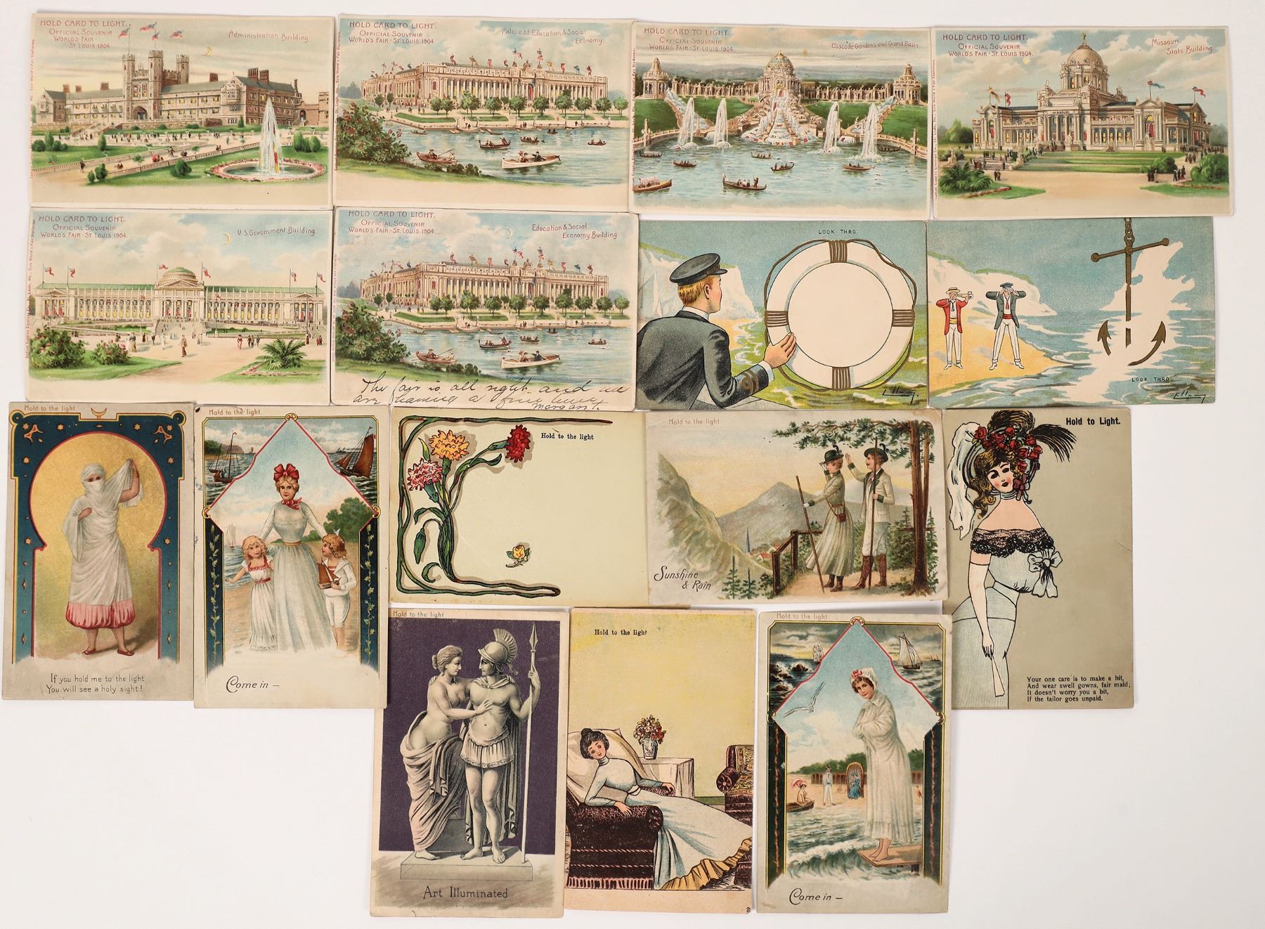 Lot of 14. Eight pre-split PC's. Five Official Souvenir 1904 St. Louis World's Fair. Postmarks : Oakland Ca., St. Louis, Clarion Iowa, Lititz PA. Remainder of cards show hidden characters that add to the main image of the card. Protective sleeves. 1900-09 Ken Prag Collection