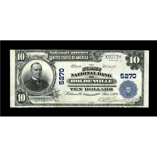 <B>Holdenville, OK</B></I> - $10 1902 Plain Back Fr. 633 <B>The First NB</B></I> Ch. # 5270<BR>Fewer than ten large examples are recorded in the census from here, with this specimen as nice as any. The cashier's signature is faded, but the signature of O.C. Fowler, V.P. is quite strong. <B>Extremely Fine.</B></I><BR><BR><b>Shipping:</b> Coin/Currency (<a target="_blank" href="http://www.heritageauctions.com/common/shipping.php">view shipping information</a>)