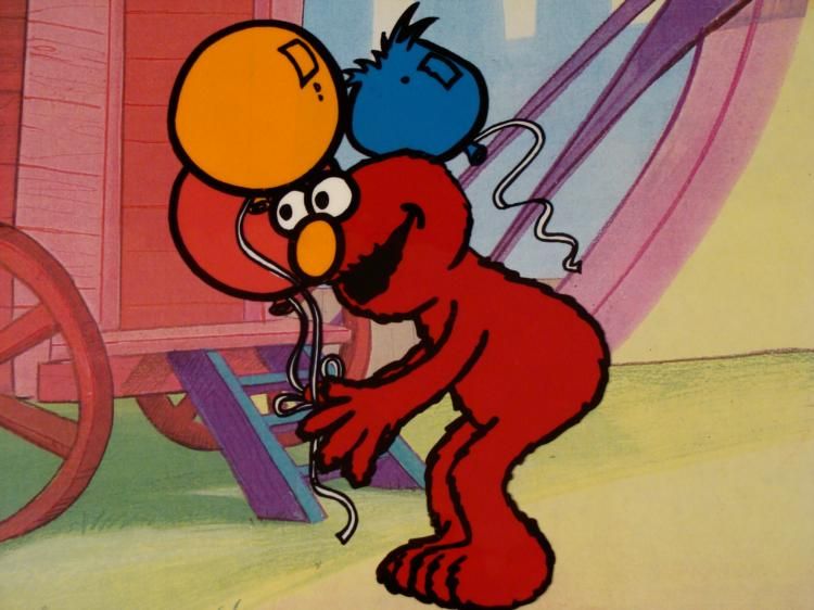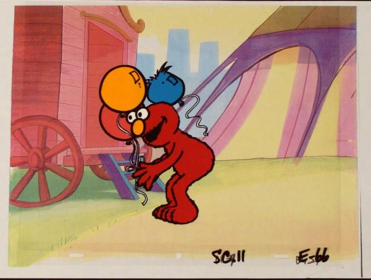 In Elmo's world everyone is happy and full of laughter. Elmo enjoys making friends and having a good time. In the cel, Elmo is holding balloons * * * Original Animation Cel & Printed Background * * Medium: Hand painted acetate celDetails: Animation notations and peg holes * * Size of cel: 10 1/2 x 12 1/2 inchesSize of background: 11 x 17 inches * * Condition: Very good; slight creases on corner * * * This is an original hand-painted cel set-up used in the production of an episode of "Sesame Street." Each one-of-a-kind set-up represents a slight change in position of the characters. When individually photographed and projected in rapid succession, the * images appear to move. * * To create production cels, the original animator's drawing is transferred onto an acetate cel (by hand-inking and/or photo copying). The cel is then hand-painted on the reverse side. The background accompanying this set-up is a printed reproduction background. * *