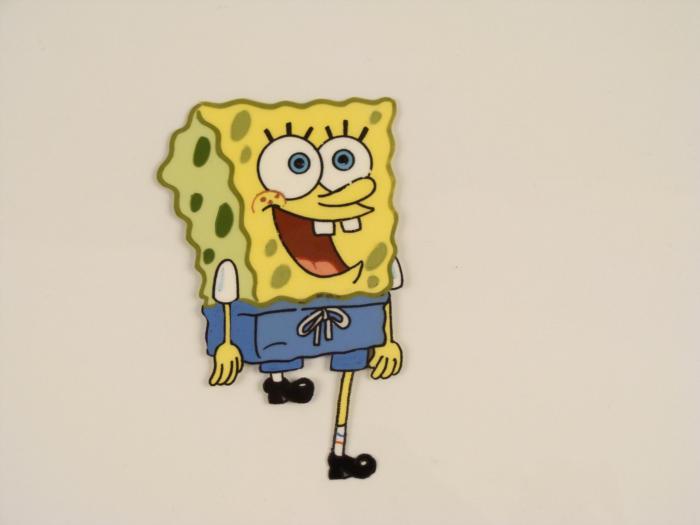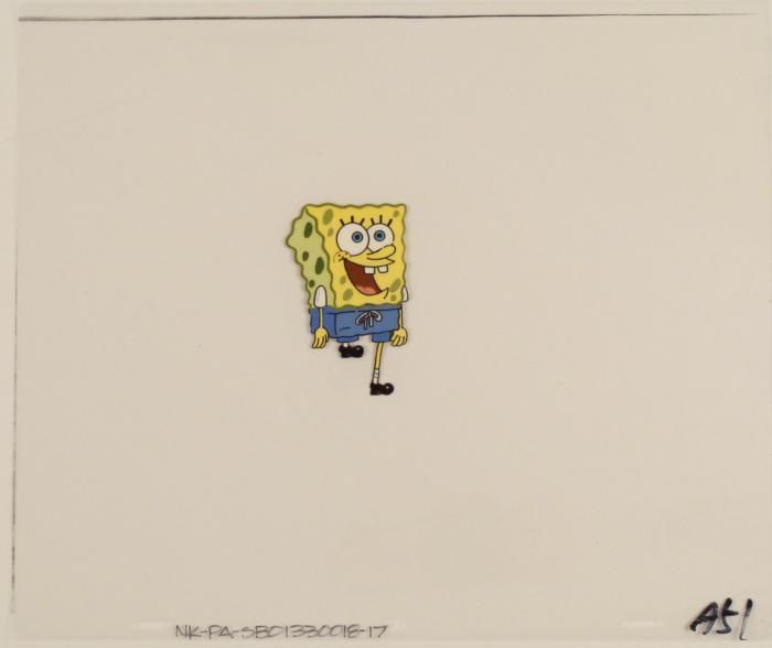 This original animation cel is from the Nickelodeon TV show SpongeBob Squarepants. The story takes place under the deep blue sea in Bikini Bottom, where SpongeBob resides. SpongeBob, who is a yellow, porous sponge, is your typical happy-go-lucky character, as he is always cheerful and enjoys making people laugh. Patrick Star, SpongeBob's neighbor who is a starfish, is your average children's show idiot, as he boasts knowing nothing and is often getting himself into ridiculous situations. Between the homes of these two lies the home of the miserable Squidward, a squid, who is known for being grouchy and playing tricks on SpongeBob and Patrick. Both SpongeBob and Squidward work at the Krusty Krab, a fast food business run by the greedy money-loving Mr. Krabs, a crab, the arch rival of the evil, possibly misunderstood, Plankton. Another neighbor, Sandy Cheeks, an athletic squirrel who normally wears an astronaut's space suit, was introduced in "Tea at the Treedome." She spends most of her time inventing and experimenting. SpongeBob is holding up his legOriginal Production Animated Cel Overall Size of Cel: 10 1/2" x 12 1/2" Very Good ConditionThis is an original hand-painted cel set-up used in the production of an episode of "SpongeBob SquarePants." Each one-of-a-kind set-up represents a slight change in position of the characters. When individually photographed and projected in rapid succession, the images appear to move.