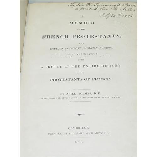 Holes, Abiel. A Memoir of the French Protestants, Who Settled at Oxford in Massachusetts, A.D. MDCLXXXVI; with A Sketch of the Entire History of the Protestants of France. Cambridge: Hilliard and Metcalf, 1826. 8vo - over 7¾" - 9¾" tall. Hard Cover. Ex-Library. Good Condition. ASSOCIATION COPY OF THIS SCARCE BOOK. iv, 84pp, bound in a nondescript paper over boards binding, with library cloth backstrip. INSCRIPTION on title page reads: "Lydia H. Sigourney's Book, a present from the Author, July 25th 1826". The author was the Father of Oliver Wendell Holmes Sr. and Pastor of the Congregational Church in Cambridge, MA. Lydia Howard Sigourney (1791-1865) was a prolific writer, with a legacy of 67 books. Covers age darkened, ffp loose, binding tight, occasional foxing. Marginalia. HUGUENOT HISTORY