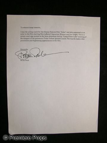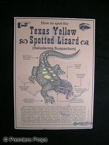 A prop detention sign from the 2003 adventure-comedy film 'Holes,' starring Sigourney Weaver, Shia LaBeouf, and Jon Voight. The film is about a wrongfully convicted boy (LaBeouf) who has been sent to a detention camp where he joins the job of digging holes for some mysterious reason. This is a prop Texas Yellow Spotted Lizard sign detailing the statistics of the 'spotted yellow lizard,' as well as the fatal attributes of the lizard's poison. Sign is affixed to a foam, cardboard backing. Comes with LOA. (measures approx. 10 3/4"x 15")