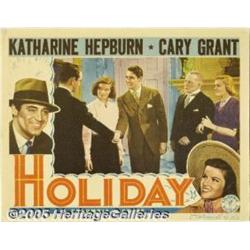 <B>Holiday (Columbia, 1938).</B></I> Lobby Card (11" X 14"). The unorthodox Cary Grant meets the very well-to-do family of his wealth obsessed fiancé, making an instant connection with the black-sheep of the family, (Katharine Hepburn) and her drunken brother (Lew Ayres), instead of the patriarchal father. There is one pinhole in the background graphics, trivial border bumps, and a small pencil notation in the upper left corner, otherwise this card is in superb condition. Very Fine/Near Mint.