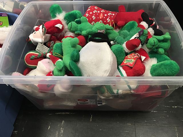 3 Bins filled with Holiday themed plush toys, chewies, toys, stockings, etc. All of these items are brand new, never used! Great buying opportunity for pet stores, rescue organizations, resellers, bulk buyers! Pet store closing, all retail merchandise to be sold. This lot must be picked up or arranged to be shipped from Torrington, CT.