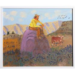 Artist: Robert Benach, Swedish/American (1927 - ) Title: Cowboy and Steer Year: 2014 Medium: Oil on Board, signed Size: 19.5 x 23.5 in. (49.53