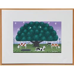 Artist: Edgar Calhado, Brazilian (1943 - ) Title: Cows under a Tree Year: circa 1977 Medium: Acrylic on Canvas Size: 8.5 in. x 11.5 in. (21.59 cm