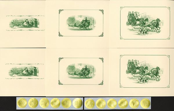 ABNC. Intaglio vignettes of Santa Claus on rooftop, Santa Claus on street, 4-horse coach, girl, two youth in toboggan, child skating. 12 cards (2 of each), 13 matching envelopes and 12 seals. Shrink-wrapped. 25 sets.