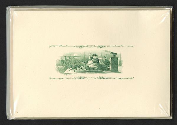 ABNC. Intaglio vignettes of Santa Claus on rooftop, Santa Claus on street, 4-horse coach, girl, two youth in toboggan, child skating. 12 cards (2 of each), 13 matching envelopes and 12 seals. Shrink-wrapped. 25 sets.