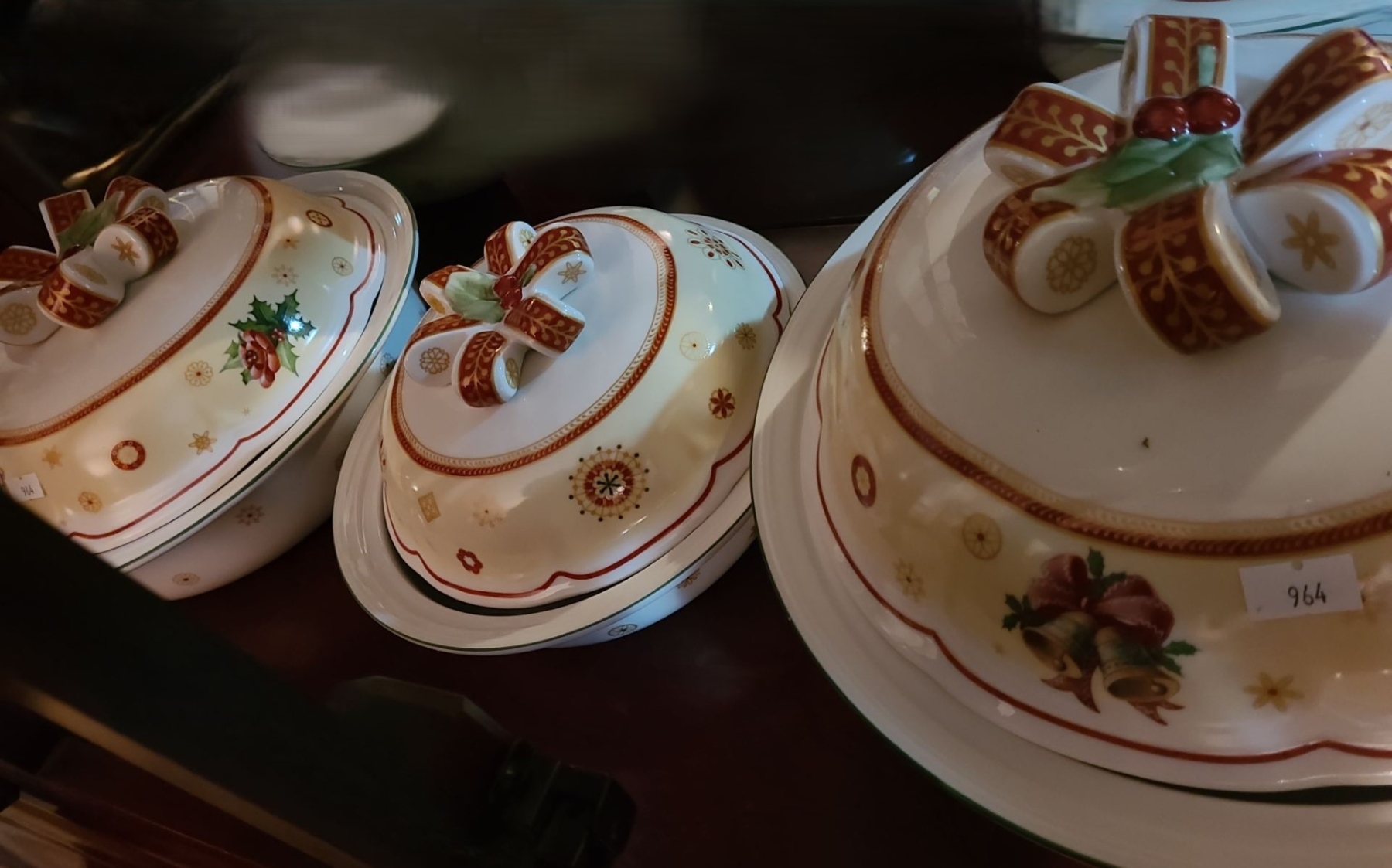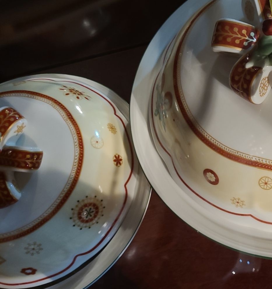 Holiday Tableware Set of 3 Serving Dishes with Lids and Bow Top Design- Largest 12 Diameter, 6 T